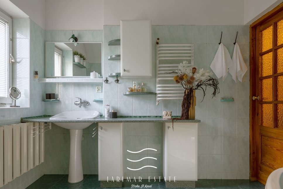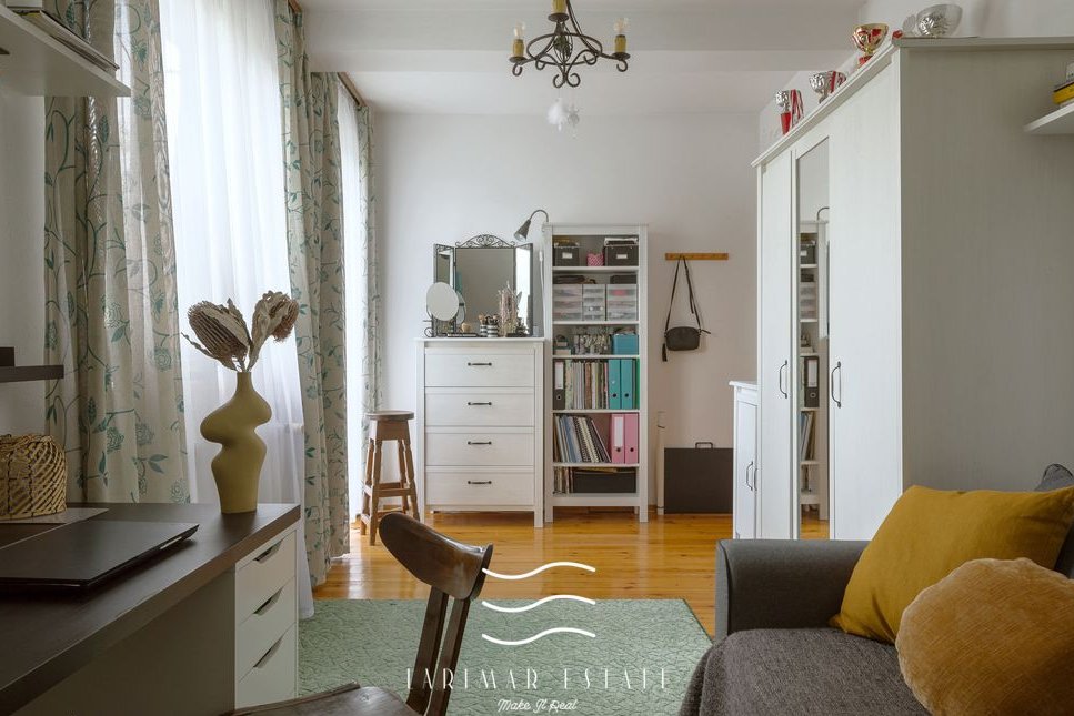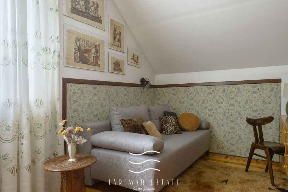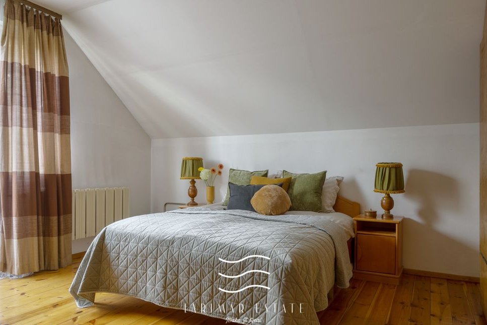 Na poddaszu są trzy sypialnie z balkonami, garderoba i duża łazienka z oknem. Pokoje są ustawne.