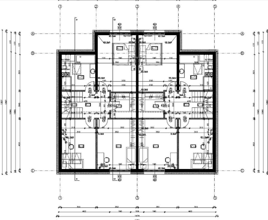 - dach dwupołaciowy z dodatkowa częścią płaską, konstrukcja drewniana, ocieplony wełną 25cm, pokryty dachówką betonową Braas w kolorze grafitowym