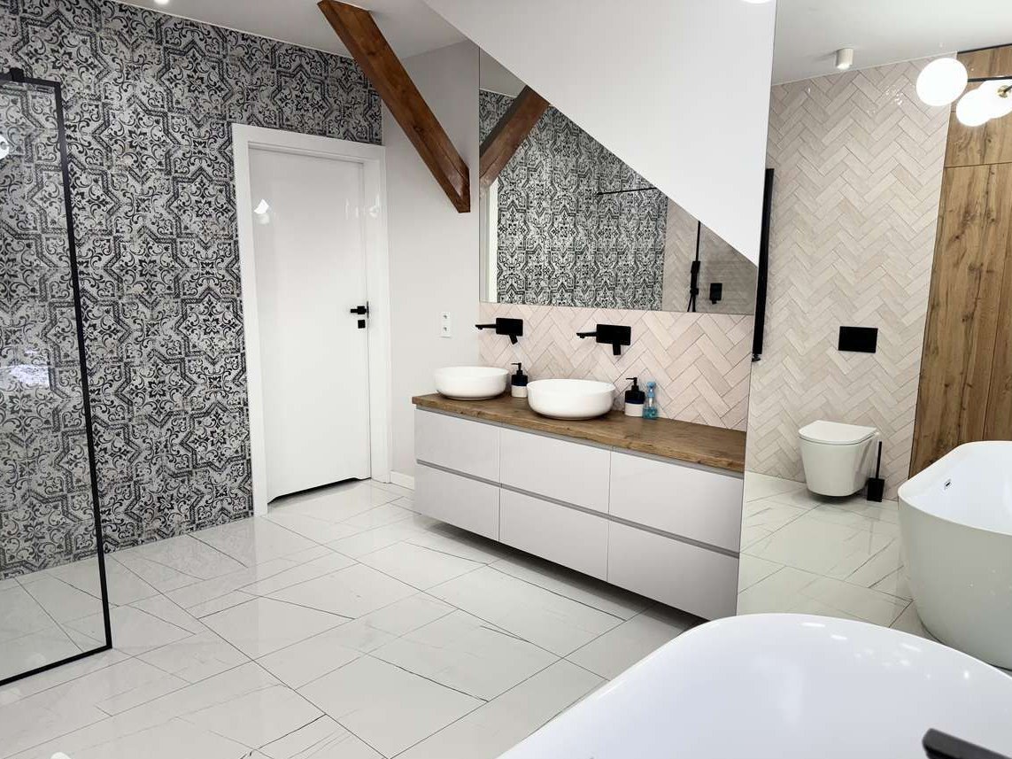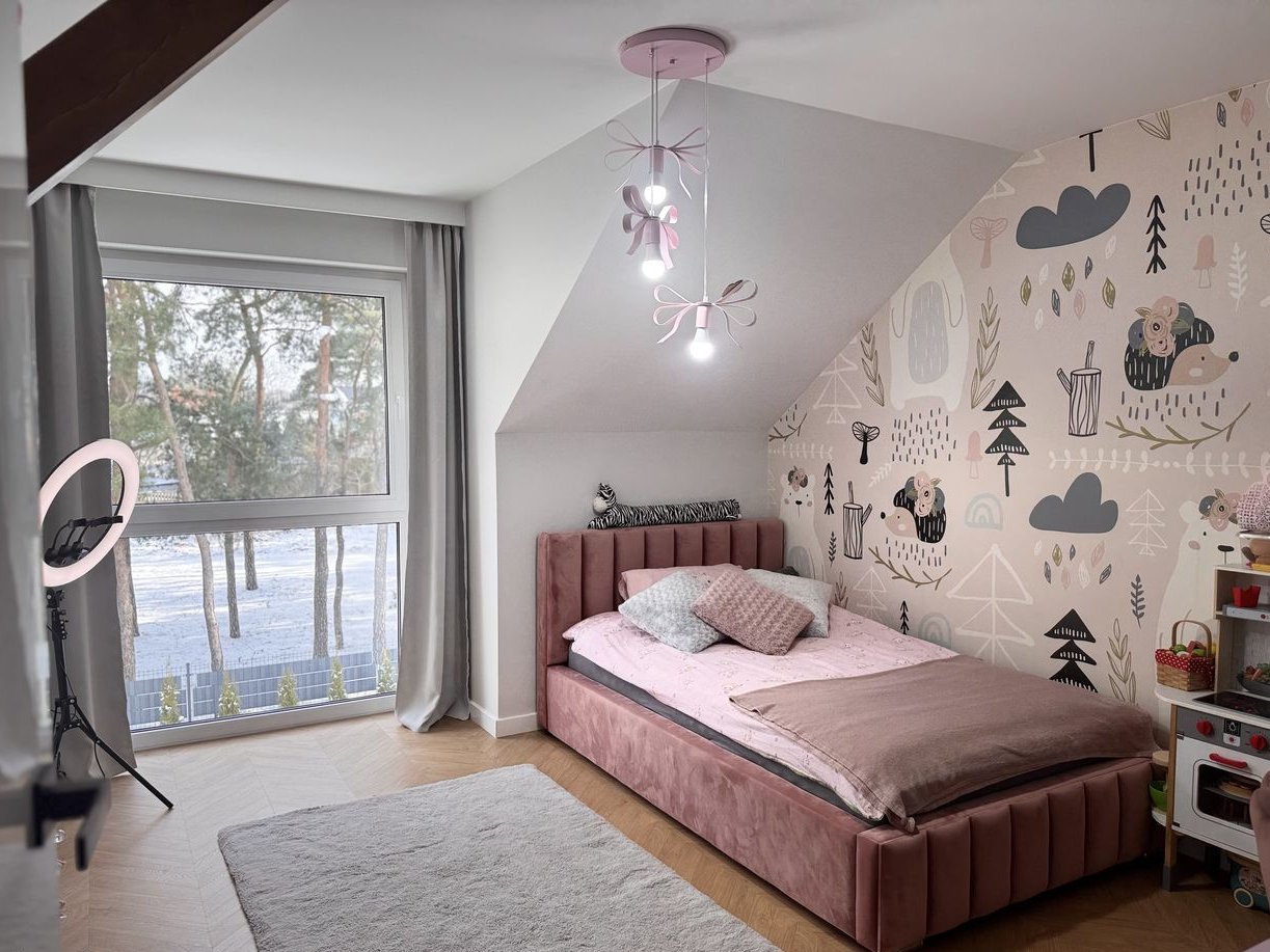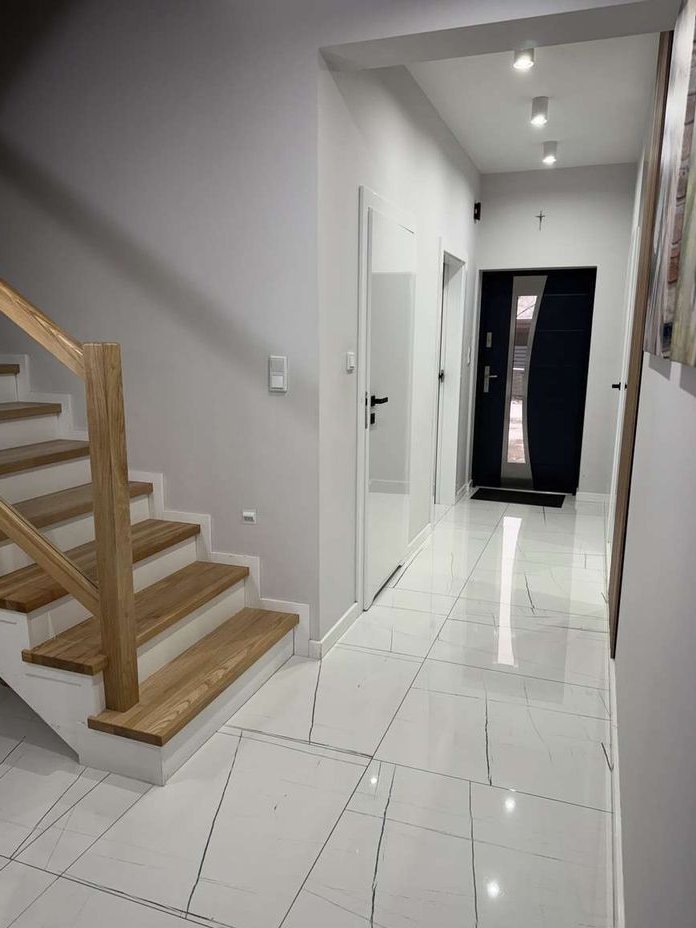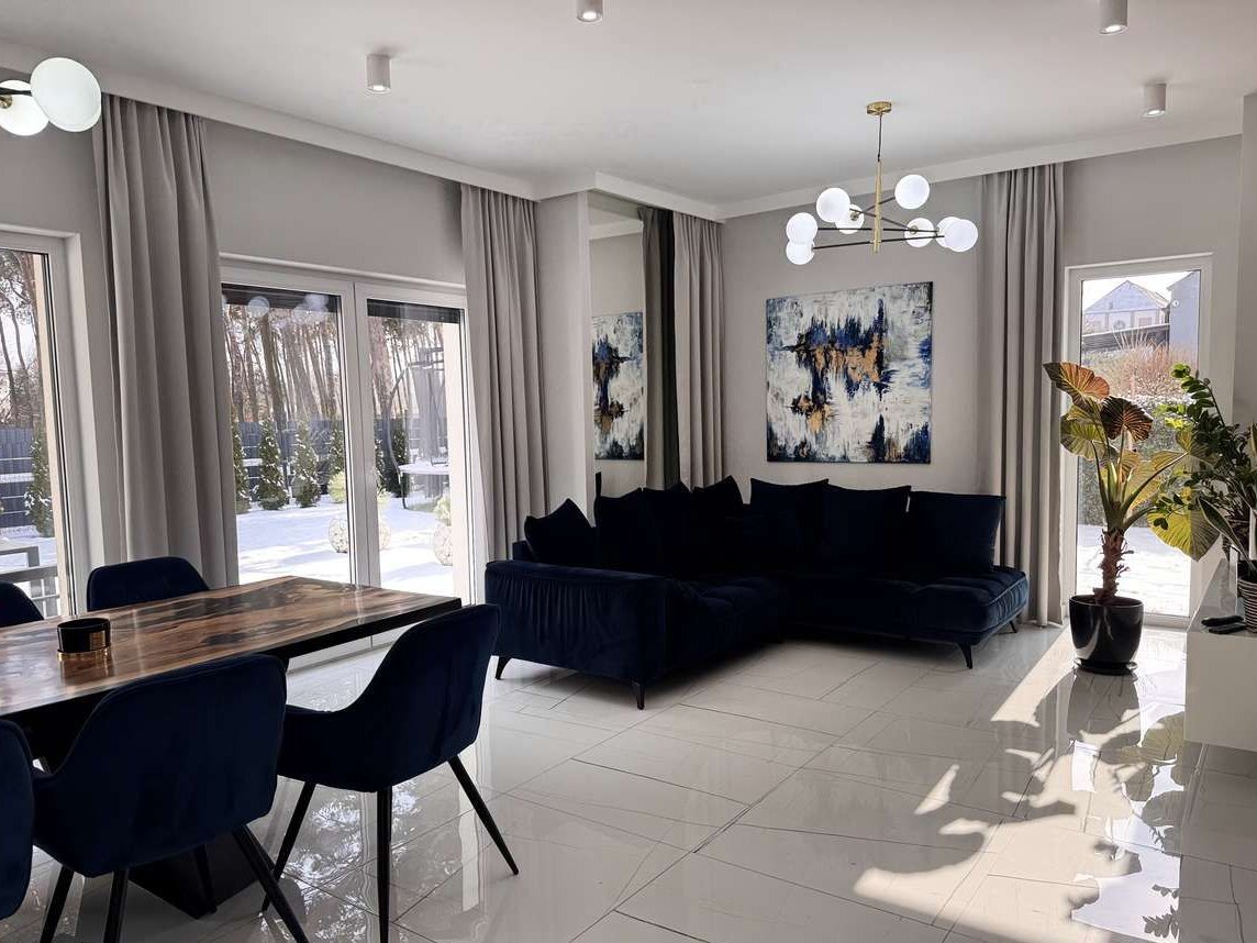 Każde pomieszczenie wyposażone jest w lustro oraz meble wykonane na wymiar, co zapewnia spójność i elegancję wnętrz. Przemyślane rozwiązanie w postaci garderoby sprawia, że w pokojach nie ma klasycznych szaf, dzięki czemu przestrzeń jest bardziej funkcjonalna i wydaje się większa. Dom sprzedawany jest z większością umeblowania – gotowy do zamieszkania bez dodatkowych inwestycji.