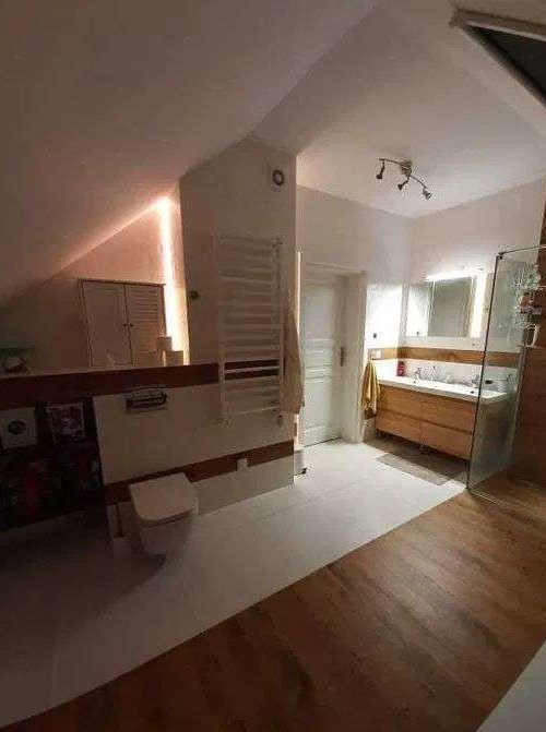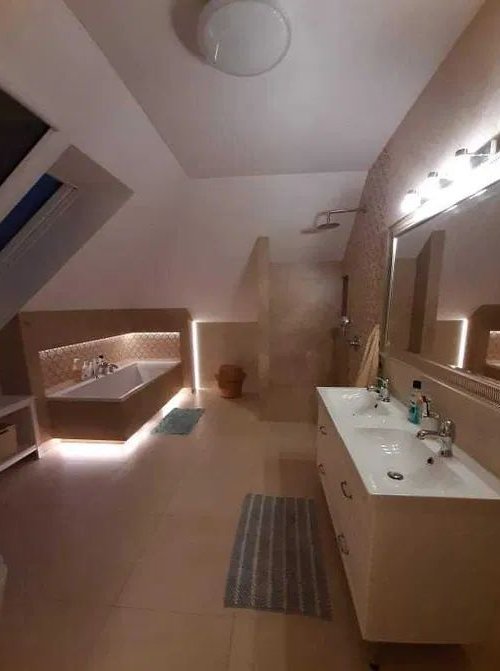 łazienki piętro - gres i płytki, ściany i sufit - podwójna płyta GK ( wodoodporna + ognioodporna)