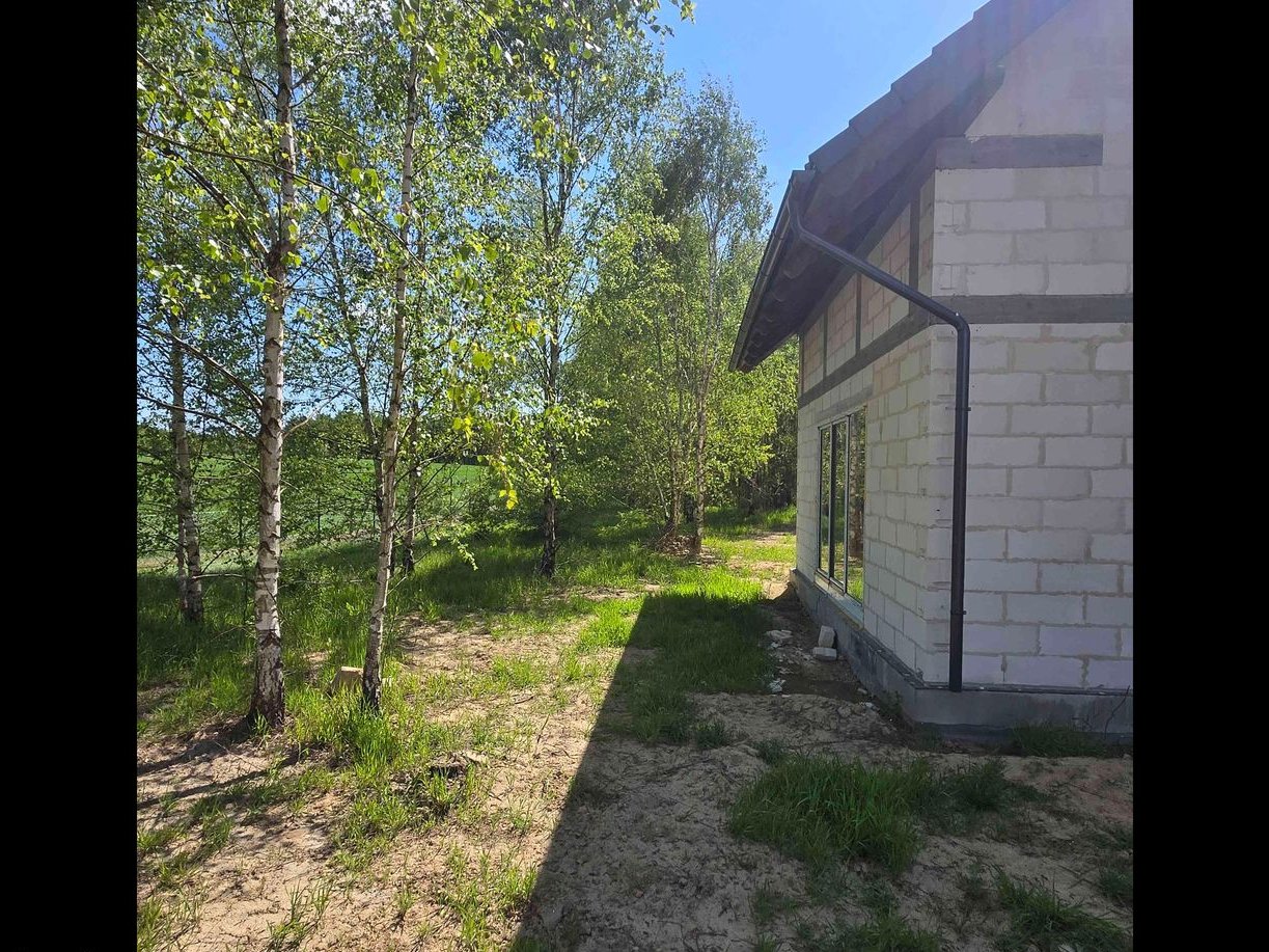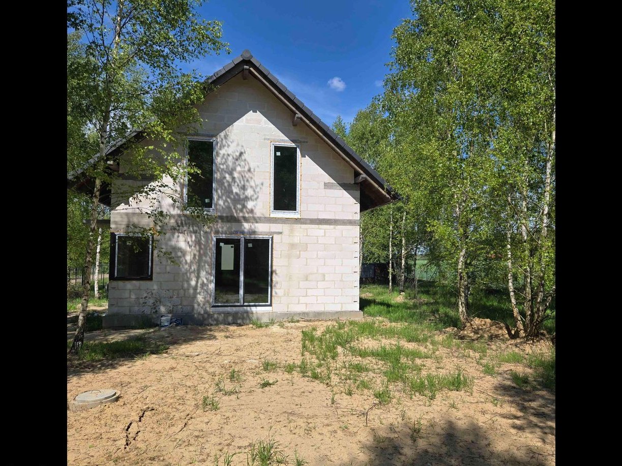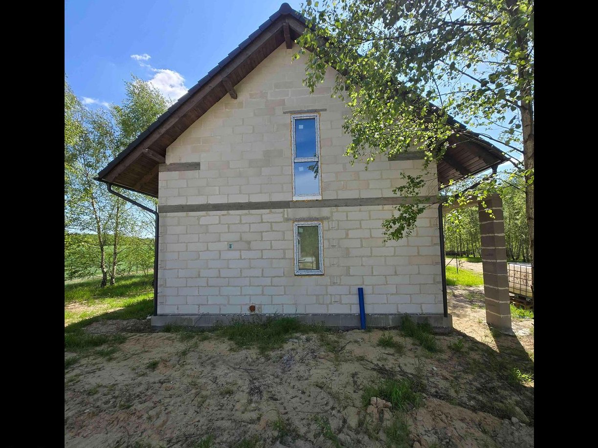 Stan - surowy zamknięty. Woda przyłączona z wlasnej studni glębinowej usytuowanej na dzialce. Przyłącze kanalizacyjne od budynku do zbiornika bezodpływowego na ścieki o poj 9 metrow sześciennych. Przyłącze energetyczne do budynku. Światłowód Orange w realizacji. Możliwość wykończenia domu do stanu pod klucz. Zapraszam do kontaktu. Cena do negocjacji.