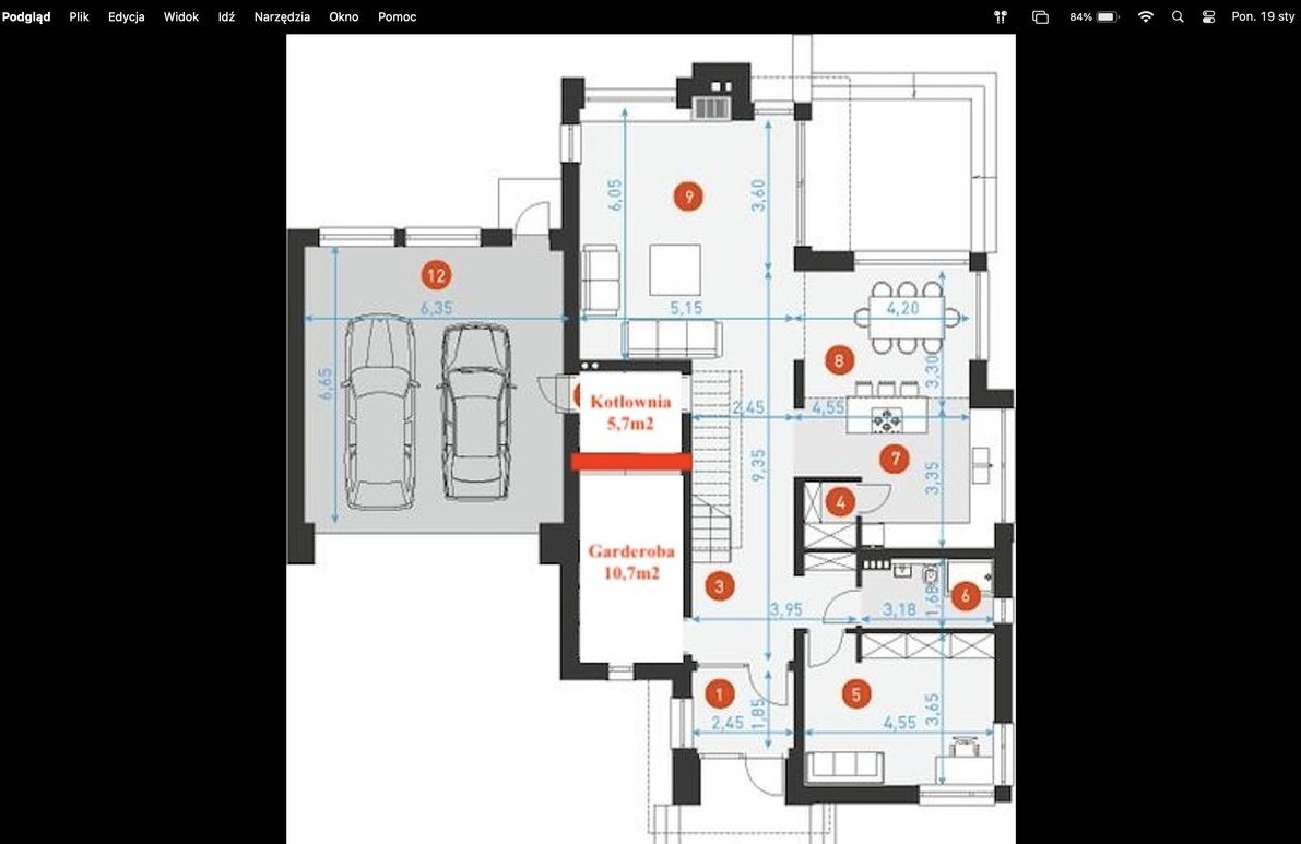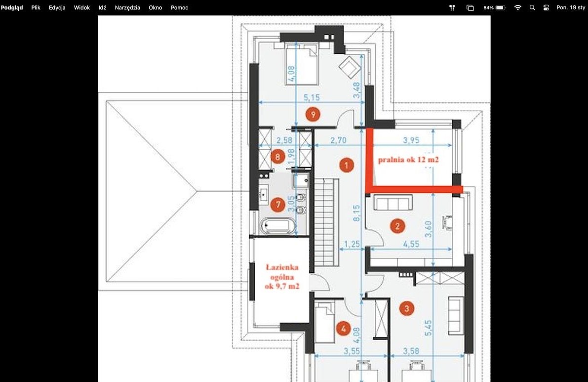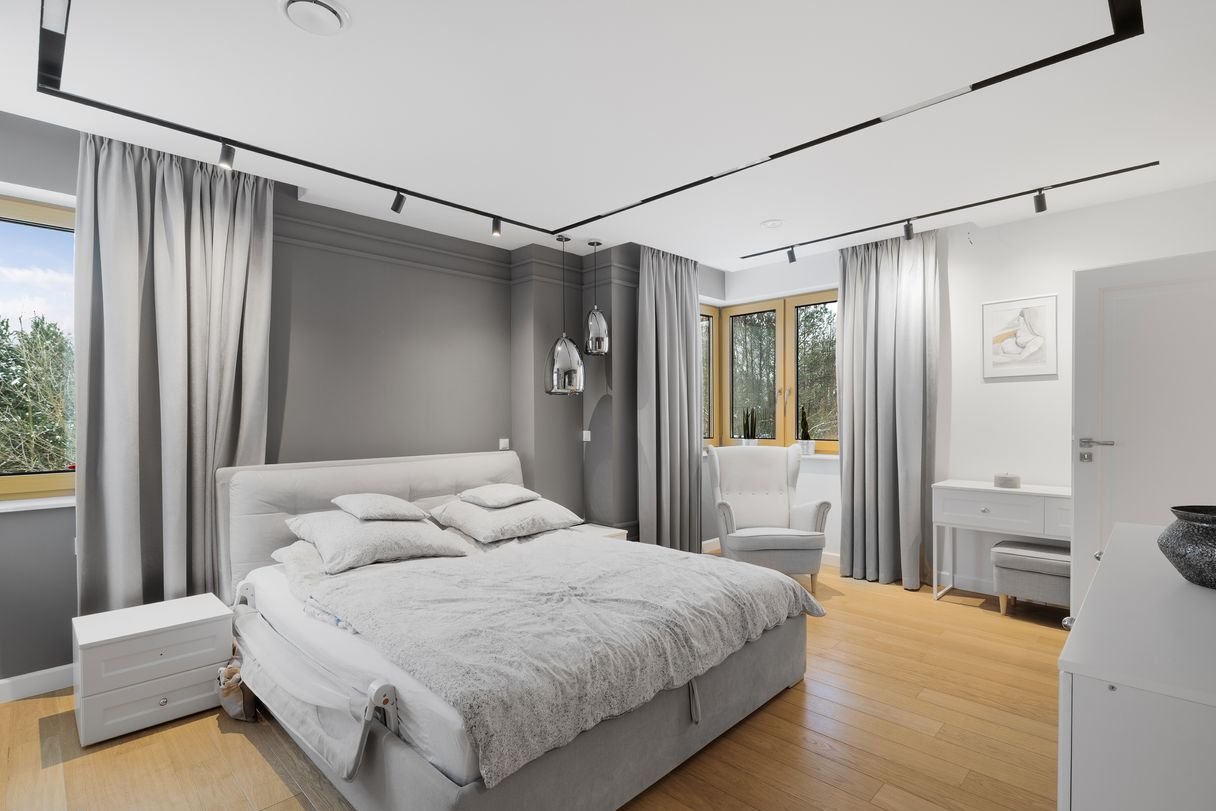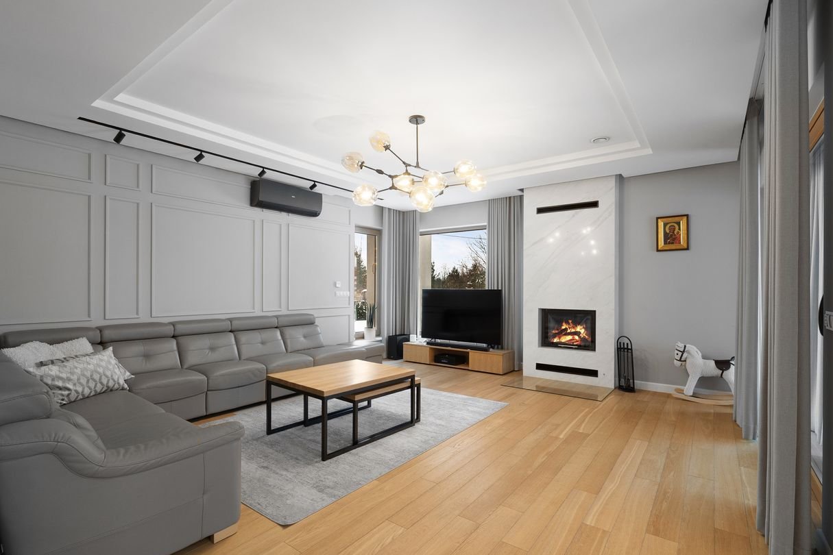 W budynku zamontowana jest rekuperacja, klimatyzacja salonu, kuchni, jadalni oraz każdego pomieszczenia na piętrze