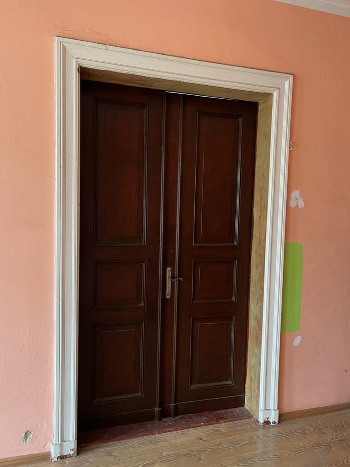 W mieszkaniu zachowanych dużo "starych" elementów: podłogi, drzwi, zdobienia sufitów, piece.