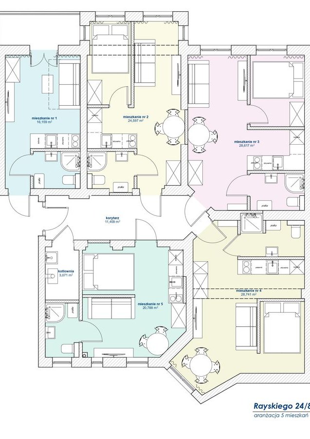 Na załączonych zdjęciach koncepcja podziału na 5 kawalerek.