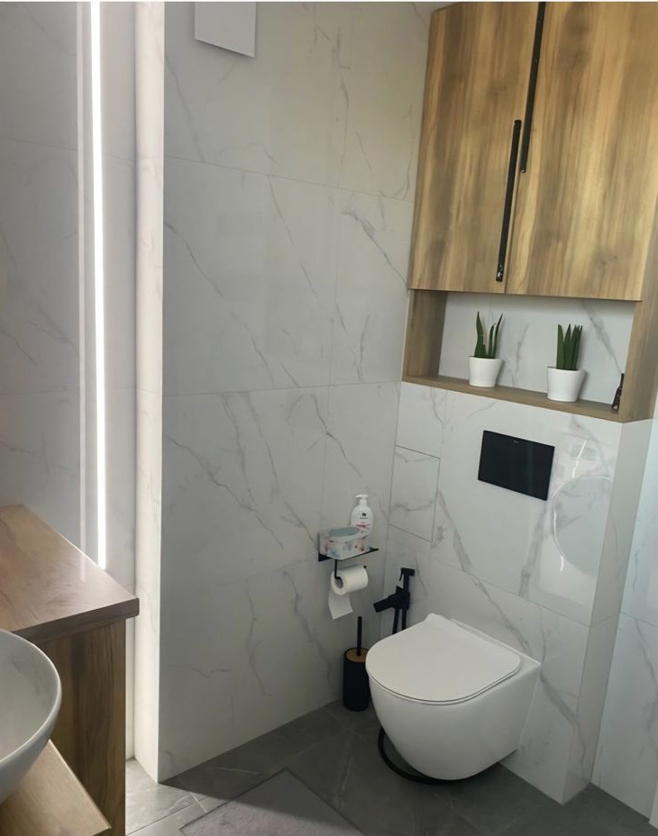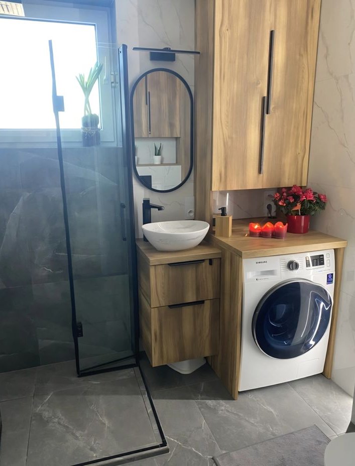 • łazienka z oknem, z kabiną walk in i toaletą z zestawem podtynkowym WC oraz bidetką, w zabudowie meblowej oraz pralko suszarka w zabudowie.