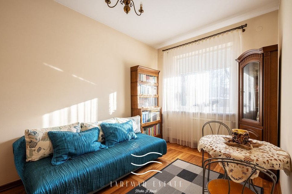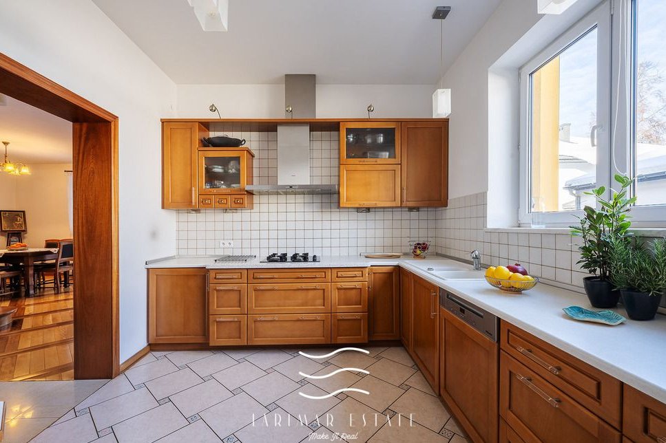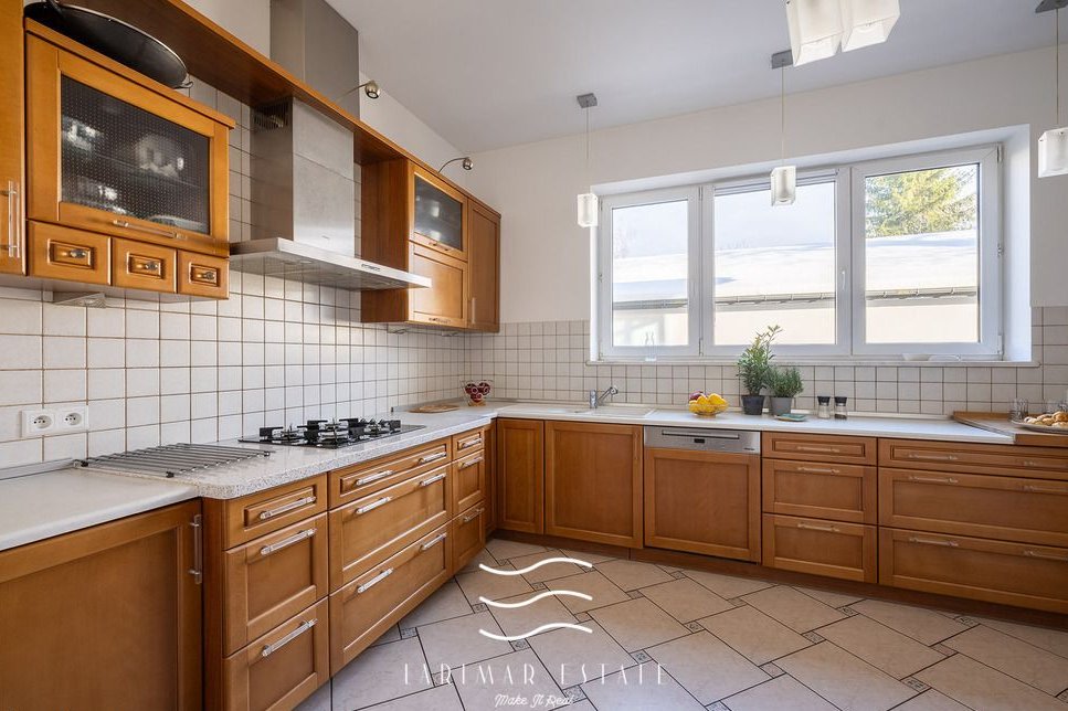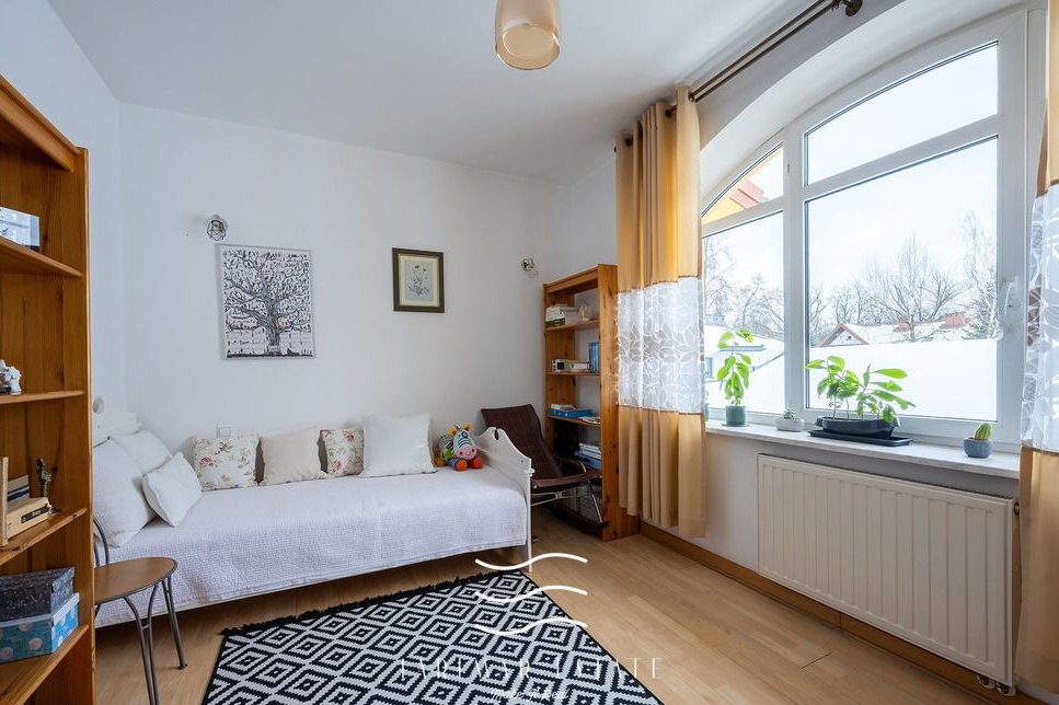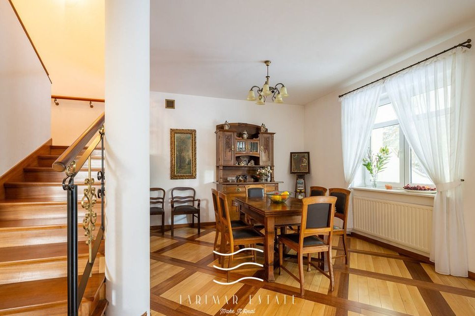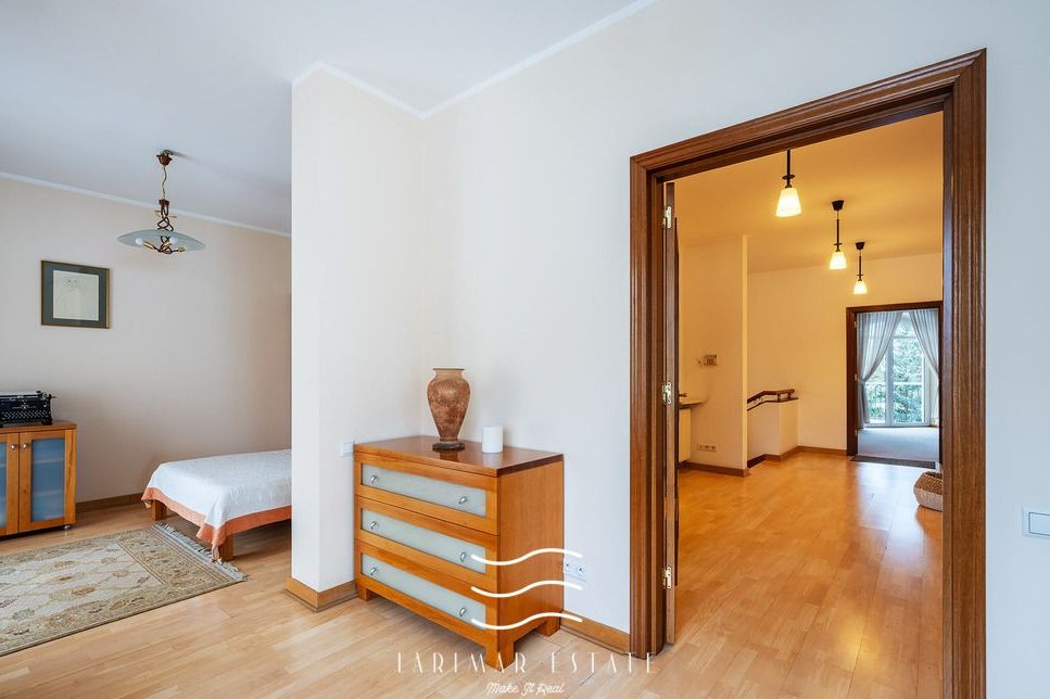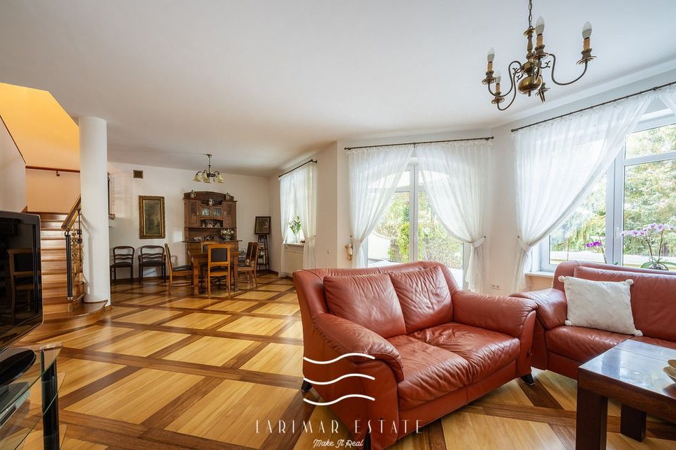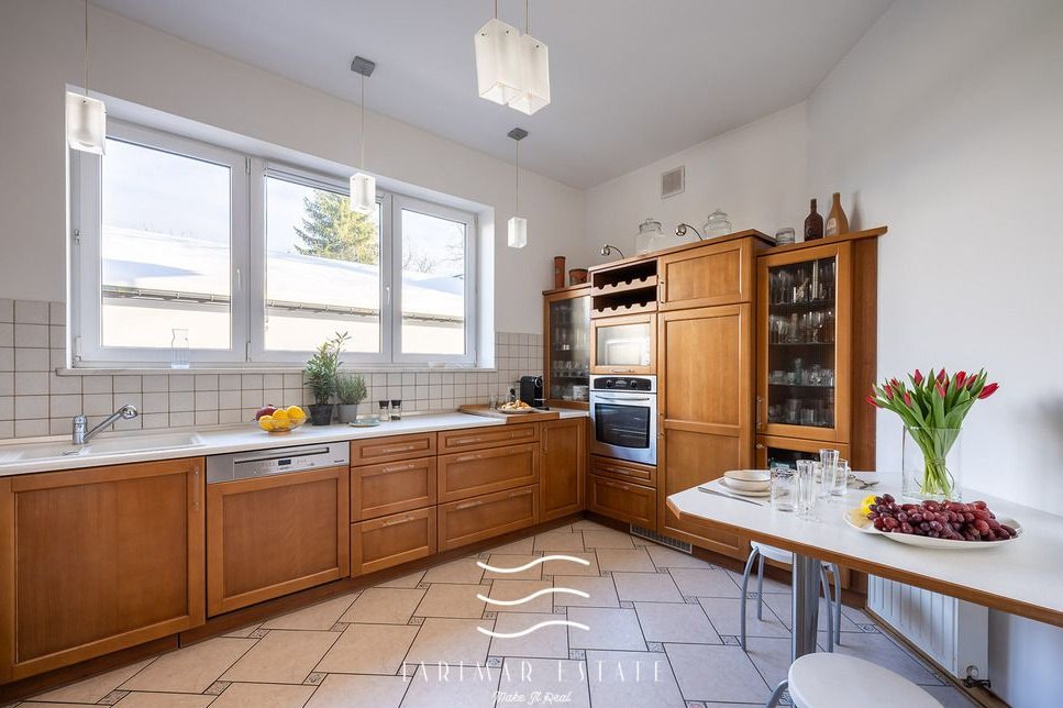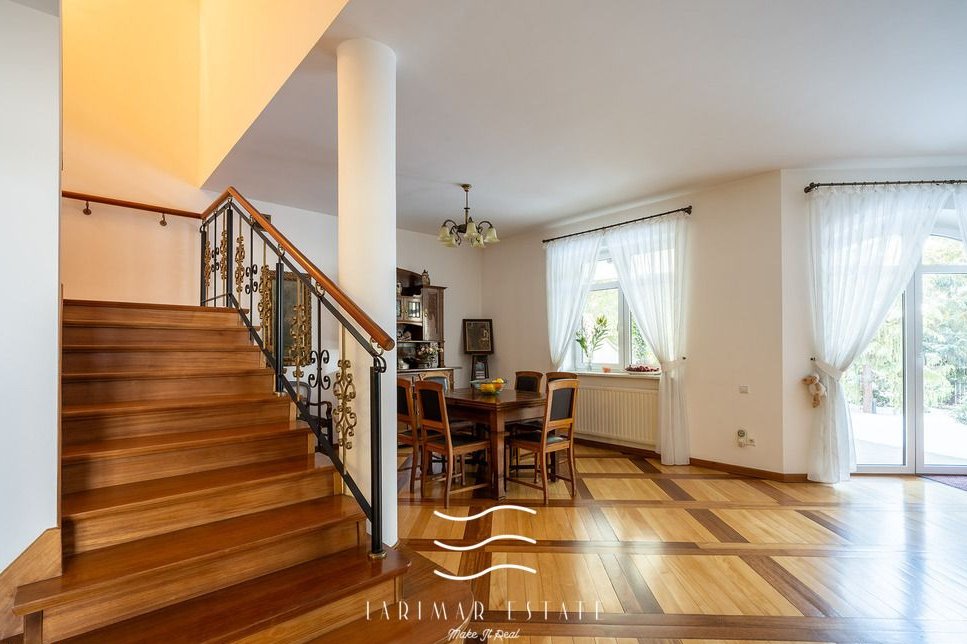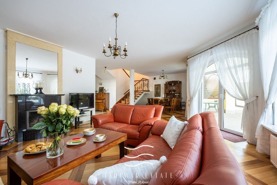 Dom zbudowano w 2002 roku przez najlepszych fachowców. Dom jest całoroczny, obszerny z niezwykle przyjemną atmosferą. Ustawne, duże pokoje, piękny salon z kominkiem z płynnym przejściem do dużej jadalni, z wyjściem na taras i do uroczego ogrodu to idealne miejsce na spotkania rodzinne i towarzyskie. Oddzielna, duża, w pełni wyposażona kuchnia z oknem. Na szczególną uwagę zasługują bardzo wygodne i elegancko wykonane schody oraz piękny parkiet. Na parterze znajduje się też sypialnia i łazienka z prysznicem - świetnie sprawdza się przy przyjmowaniu gości lub dla osób starszych z problemami wchodzenia po schodach. Na piętrze są 3 oddzielne sypialnie, 2 łazienki, garderoba i gabinet oraz uroczy ogród zimowy. Na poddaszu ogromna, już wykończona przestrzeń do przechowywania. Garaż w bryle budynku. Przed domem miejsce na 2 samochody.