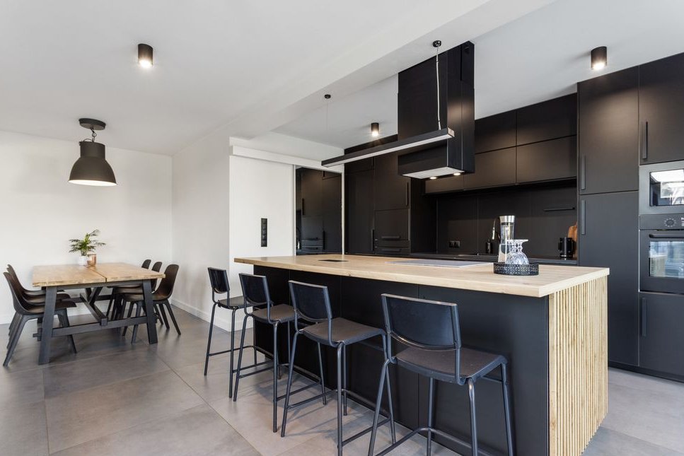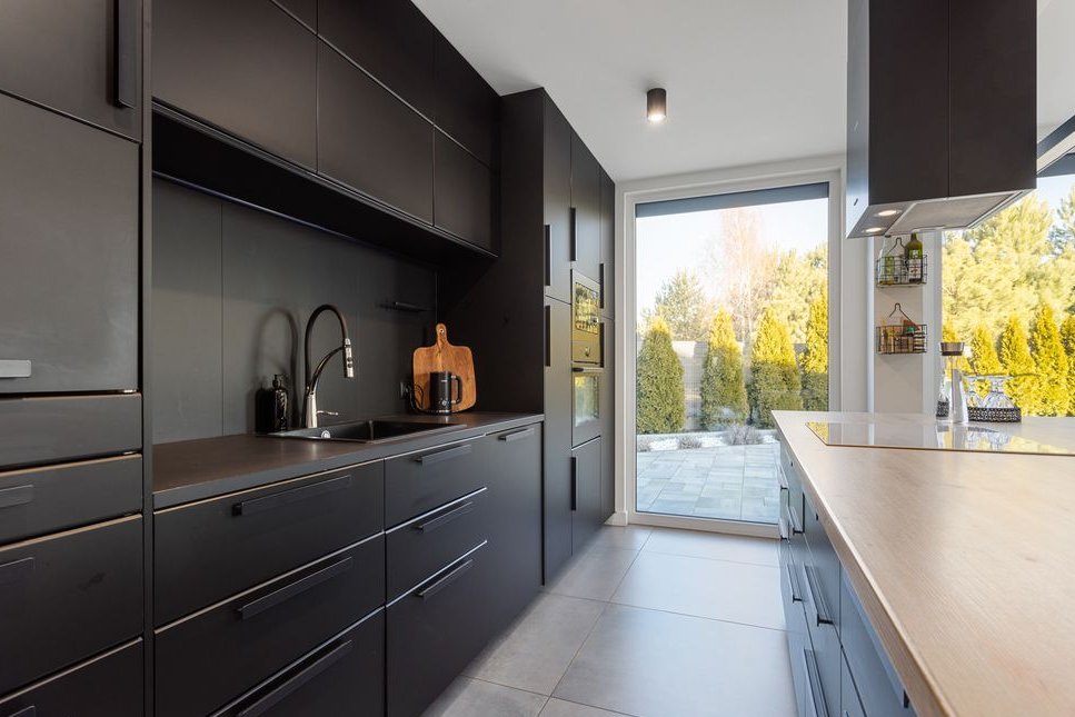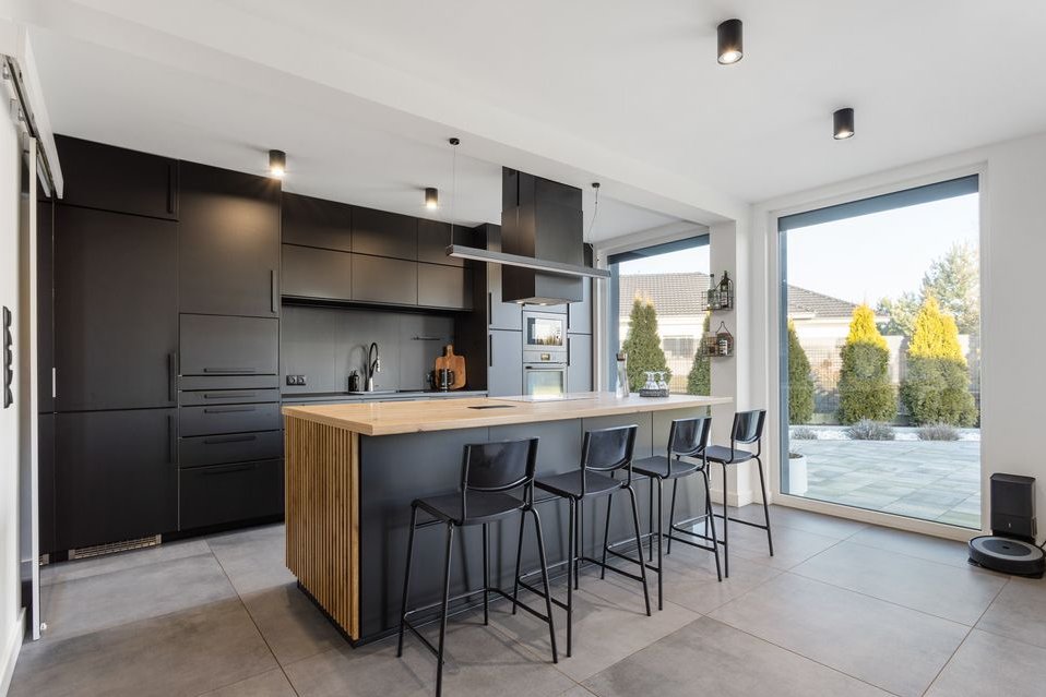 Designerska, czarna kuchnia z wyspą i ukrytą spiżarnią