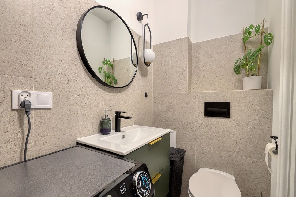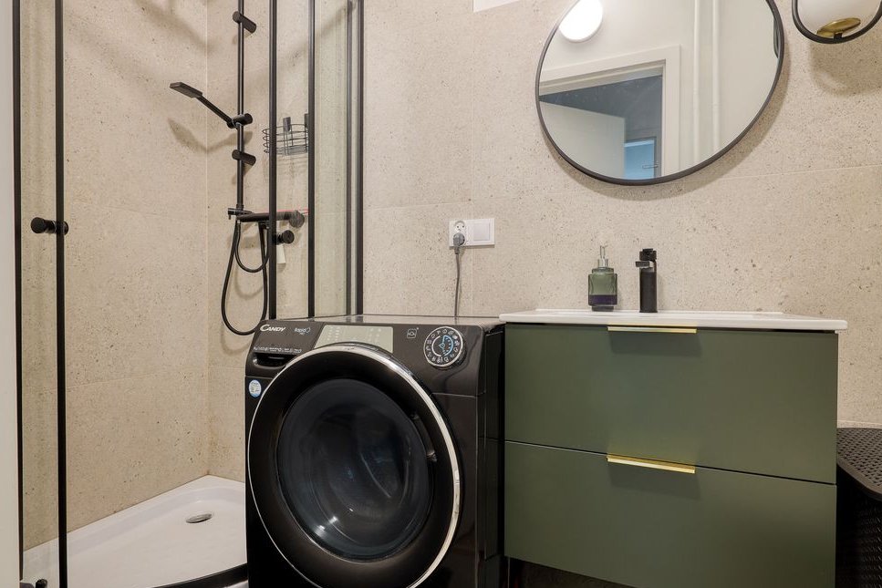 Łazienka: Elegancka i nowocześnie wykończona łazienka została zaprojektowana tak, by zapewniać wygodę codziennego użytkowania. Znajduje się w niej prysznic, toaleta, umywalka, szafka oraz pralka. Starannie dobrane materiały i detale wykończeniowe nadają wnętrzu spójny i estetyczny charakter.