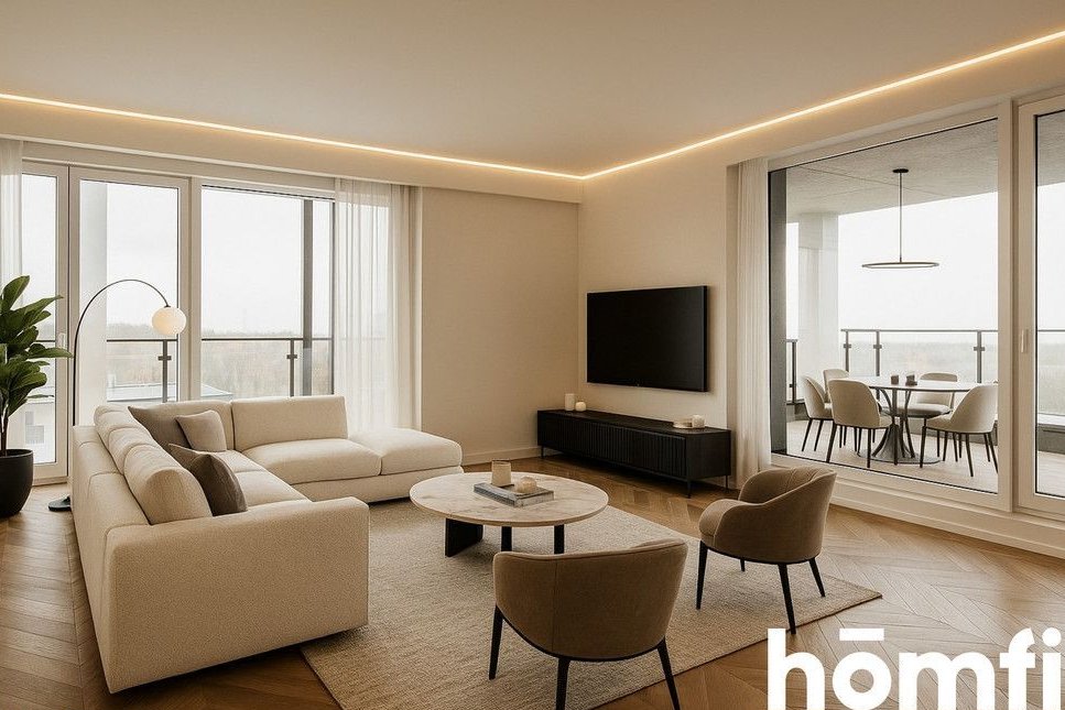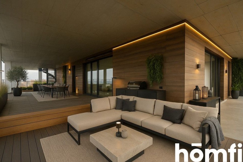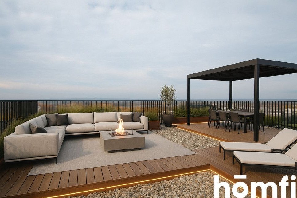 Cztery imponujące tarasy otaczają apartament, tworząc wyjątkową przestrzeń do życia – idealną na odpoczynek, pracę zdalną, spotkania towarzyskie czy obserwację wschodów i zachodów słońca.