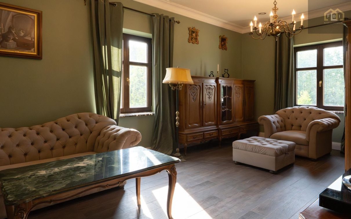 Antyczne drewniane meble oraz eleganckie tapicerowane sofy, fotele oraz krzesła nadają wnętrzom ponadczasowy styl. Uwagę przyciągają kunsztownie zdobione kominki oraz starannie dobrane dekoracyjne detale.