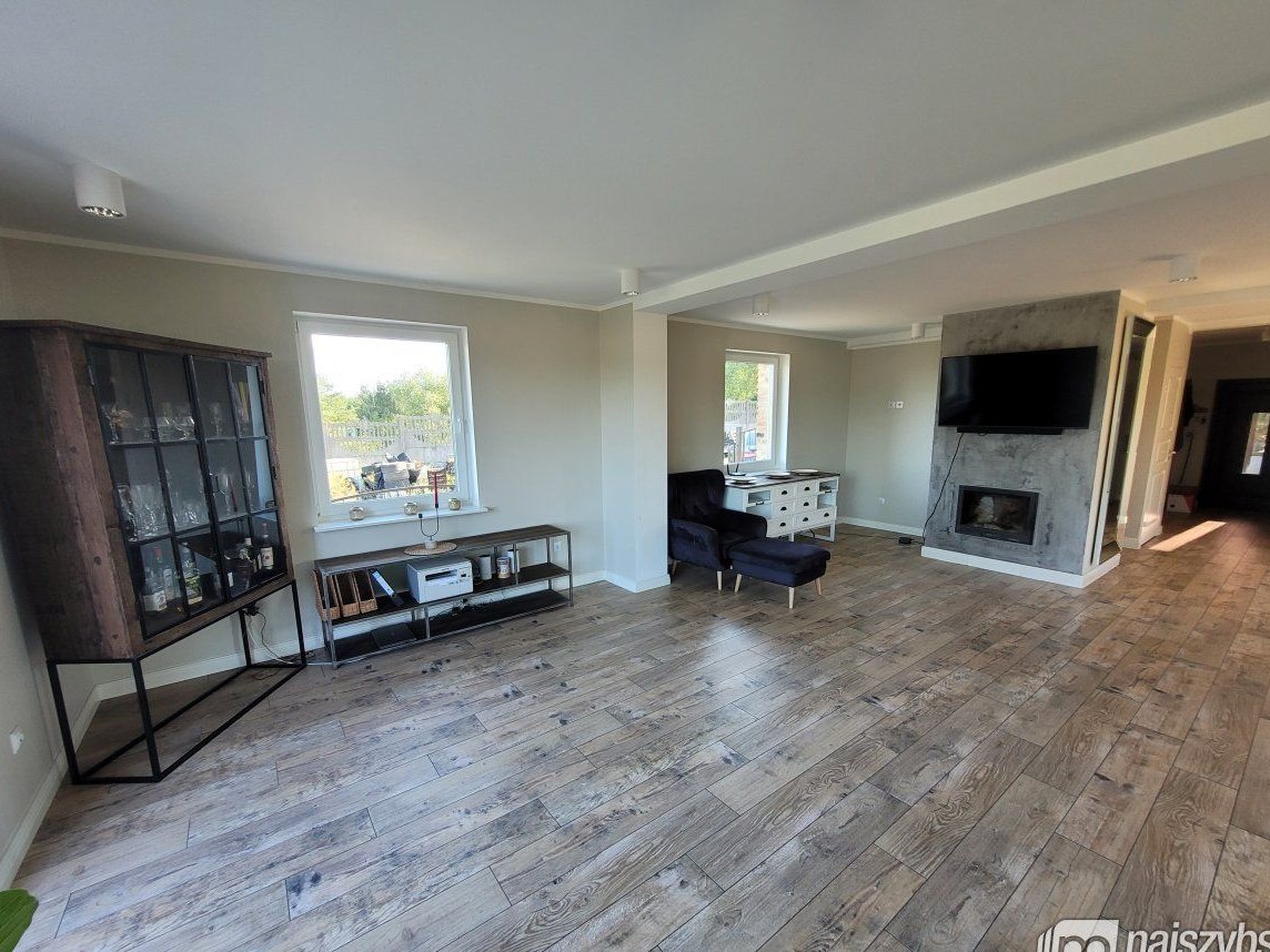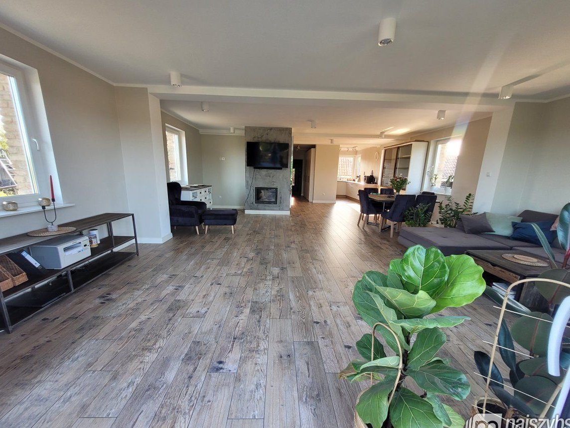 Przestronny salon połączony z kuchnią, z wyjściem na taras.