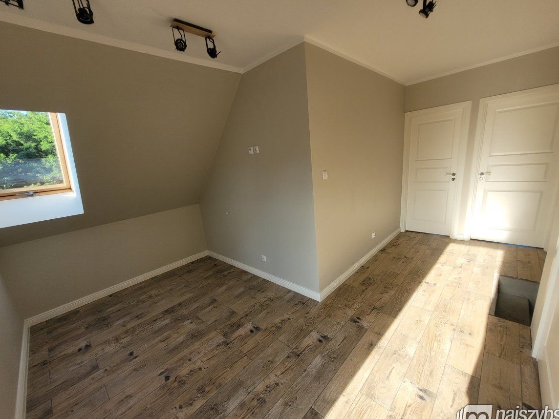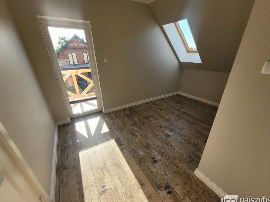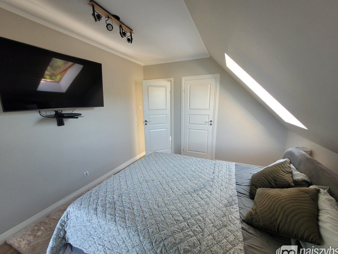 Dwie jasne i przestronne sypialnie(jedna z garderobą) z bezpośrednim wyjściem na taras z drewnianymi barierkami.