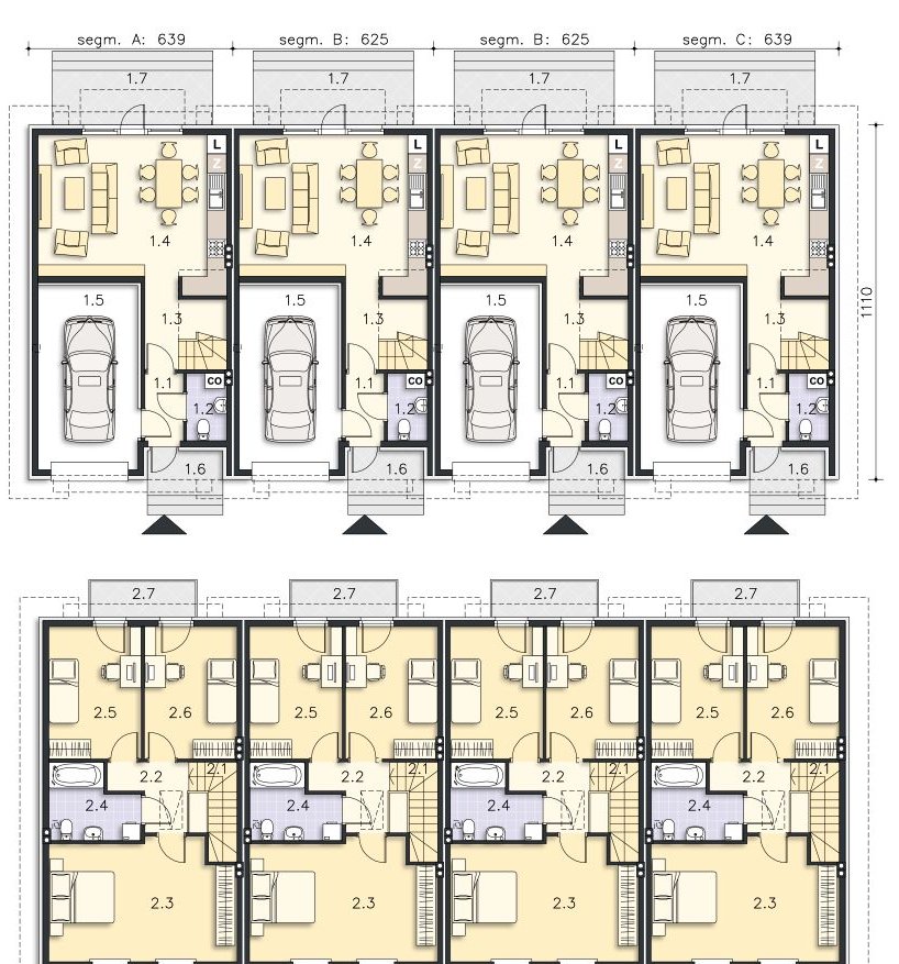 - łączna powierzchnia segmentu środkowego: 152 m² + ogród około 93 m²