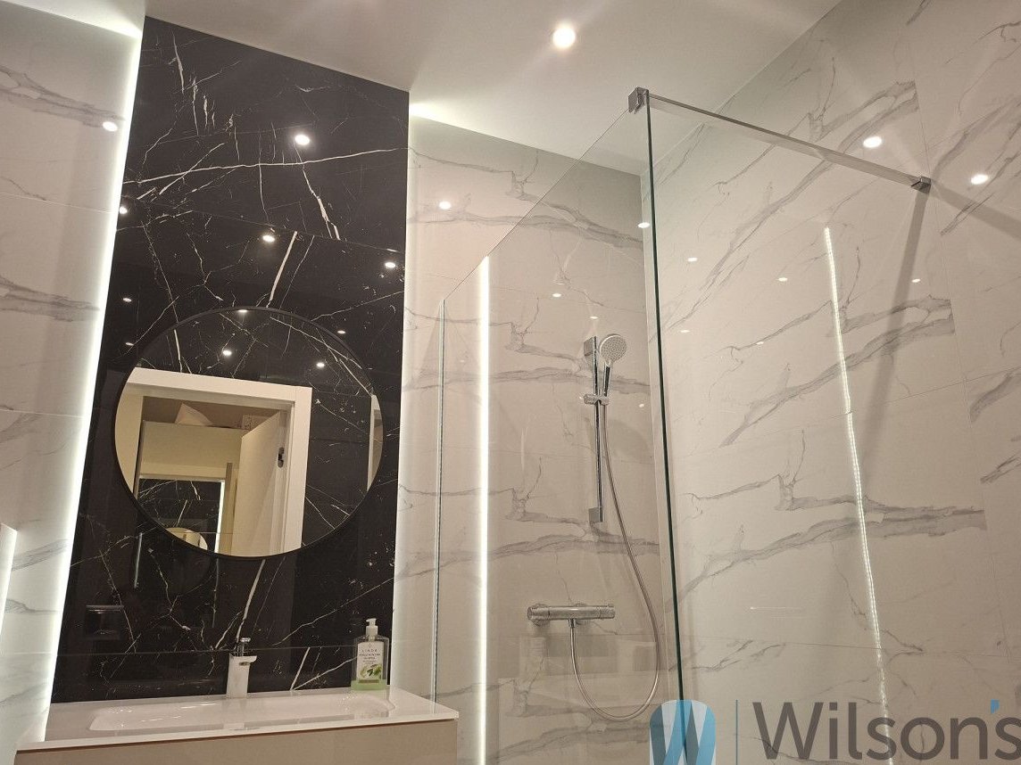 Przedpokój (5,46 m. kw.) z podwieszanym sufitem i ledami oraz dwumetrową szafą z lustrami powiększającymi optycznie przestrzeń, wieńczą antywłamaniowe drzwi.