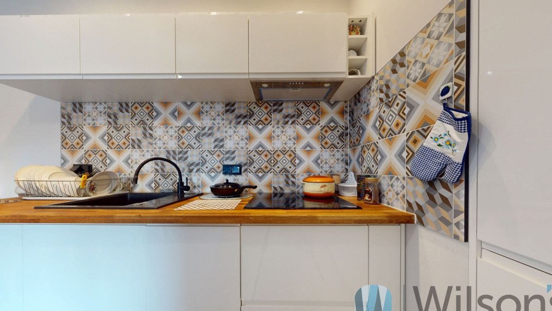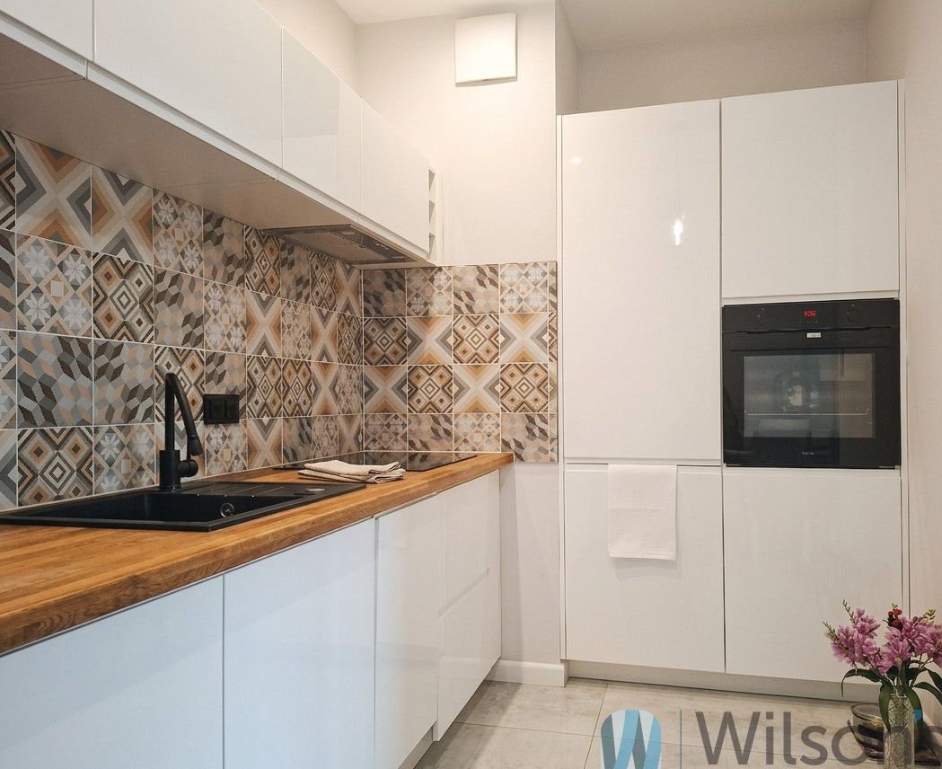 Przytulna kuchnia w aneksie, zabudowana meblami na wymiar, zachęca do gotowania sprzętami świetnej jakości: płytą indukcyjną Bosch, piekarnikiem Amica umieszczonym poręcznie na wysokości, lodówką w zabudowie, zmywarką Indesit.