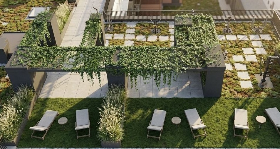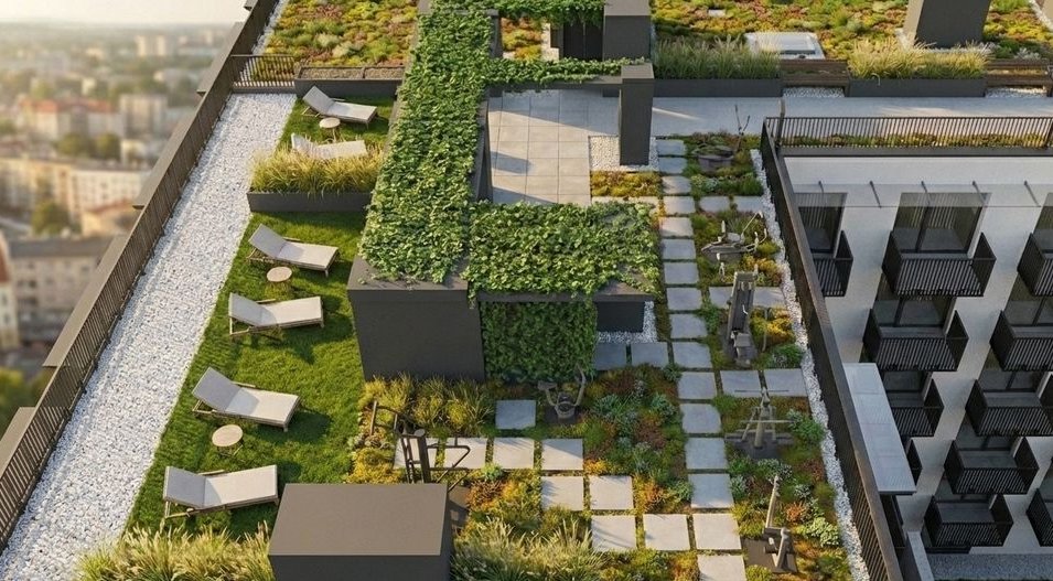 Na tarasie powstanie zewnętrzna siłownia i strefa wypoczynku w otoczeniu zieleni, idealna na poranny trening lub spokojny wieczór z widokiem na miasto.