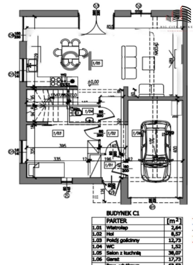 Parter: Wiatrołap, hol, przestronny salon z kuchnią, pokój gościnny, toaleta, garaż w bryle budynku.