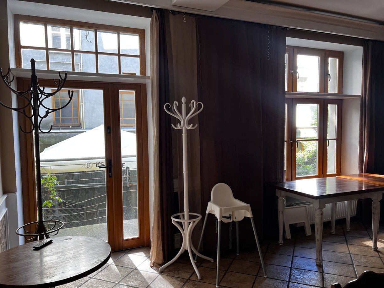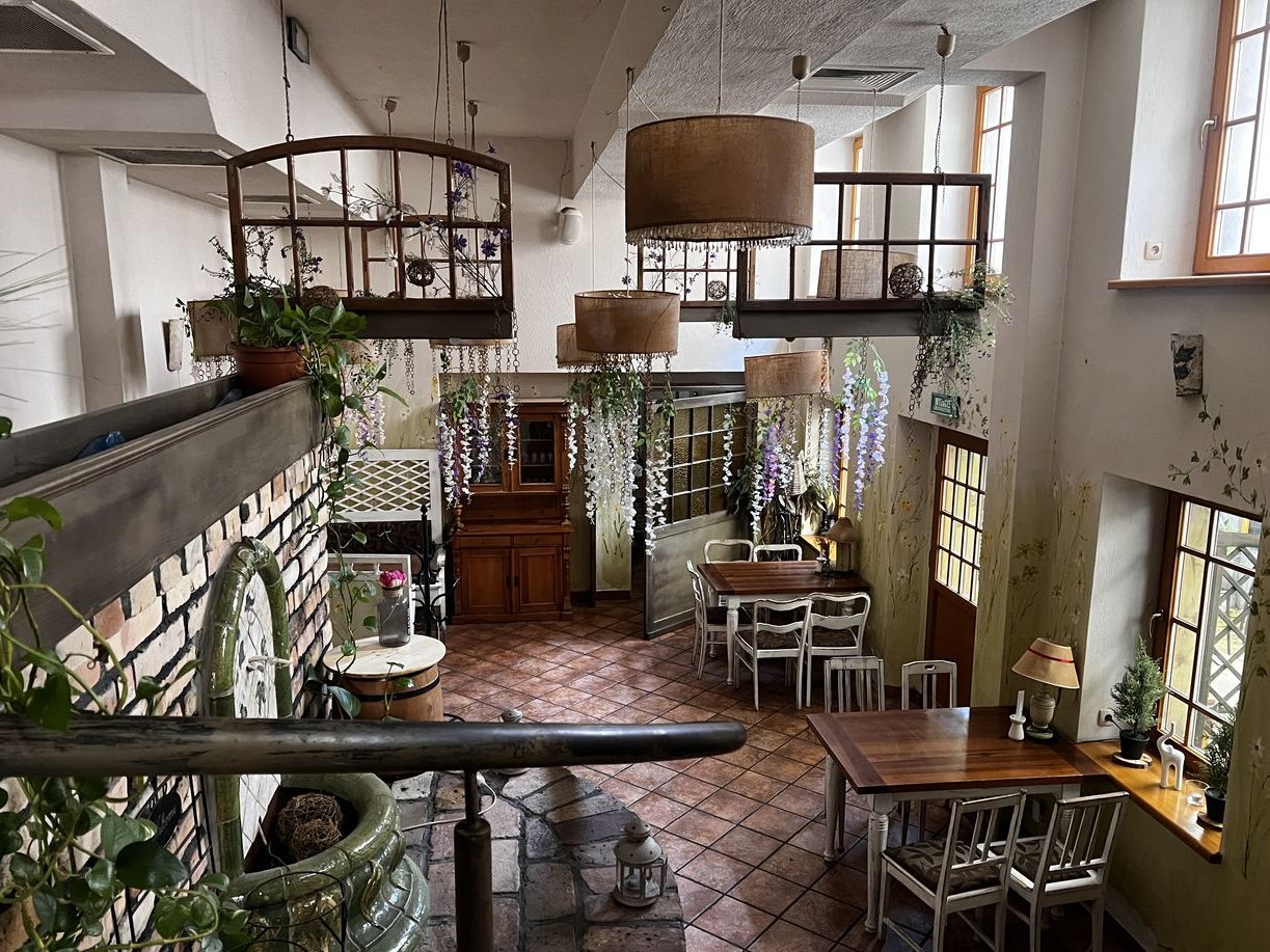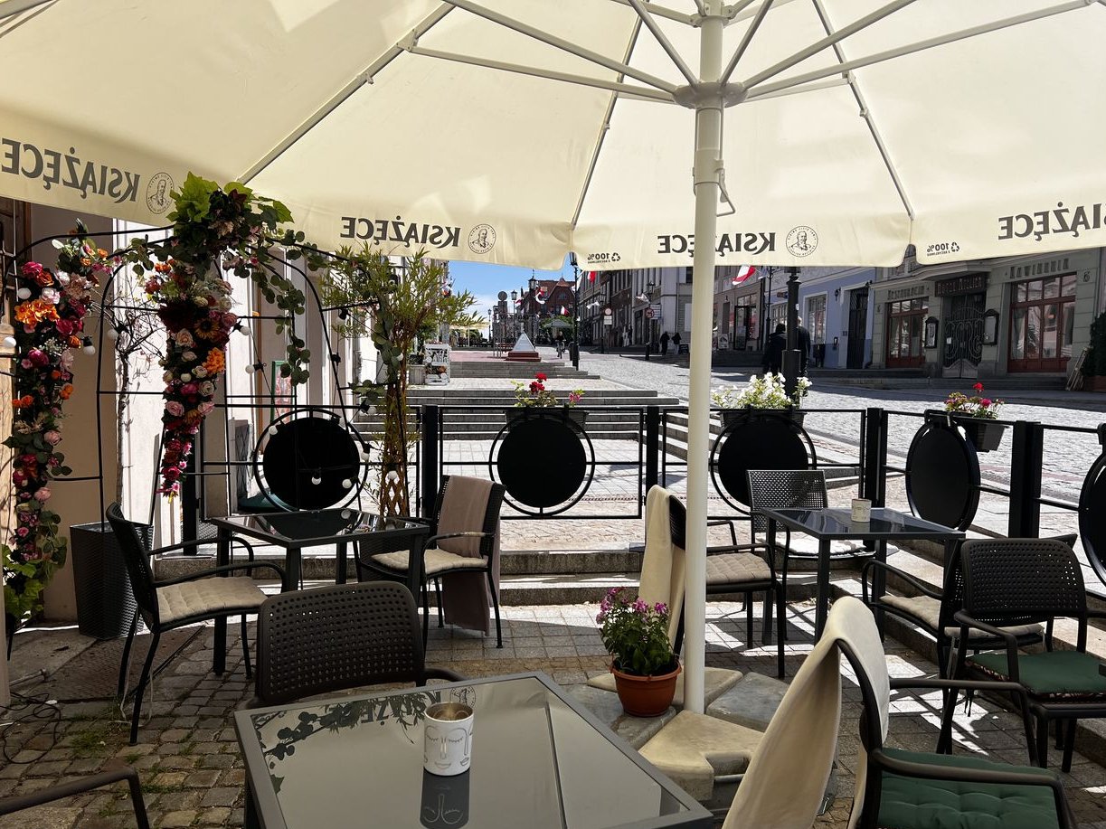 zadbane podwórze z ogródkiem gastronomicznym przynależnym do restauracji,