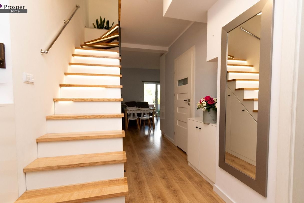 Piękne drewniane schody wykonane z jesiona podświetlone Led , schowki pod schodami ,