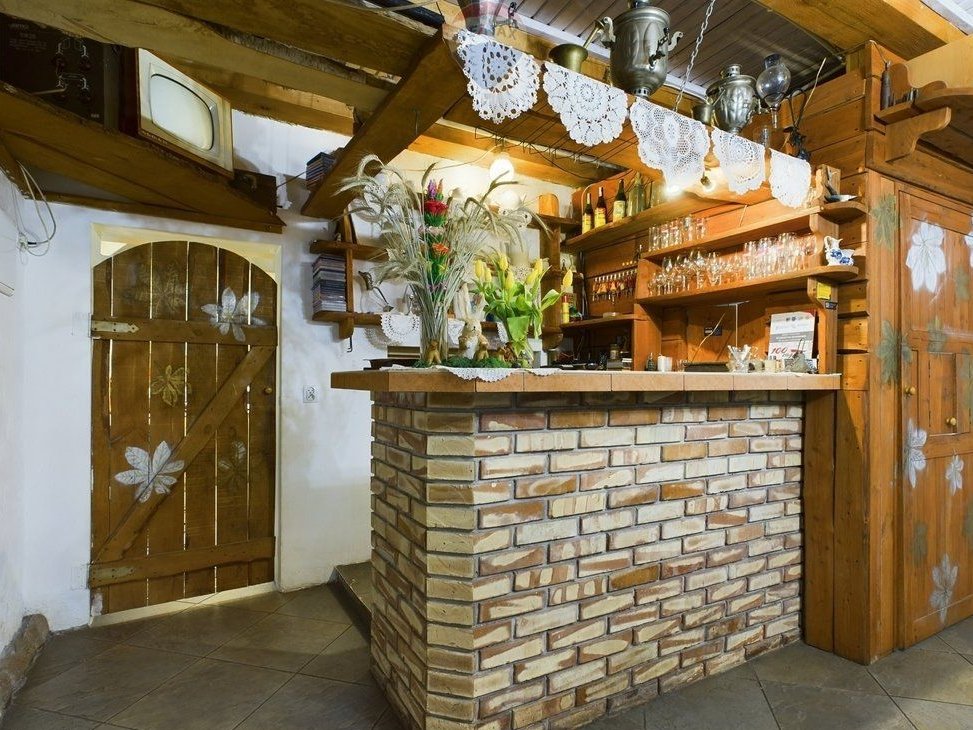 Budynek mieszkalno-gościnny z komfortowymi pokojami, jadalnią i salonem z kominkiem.