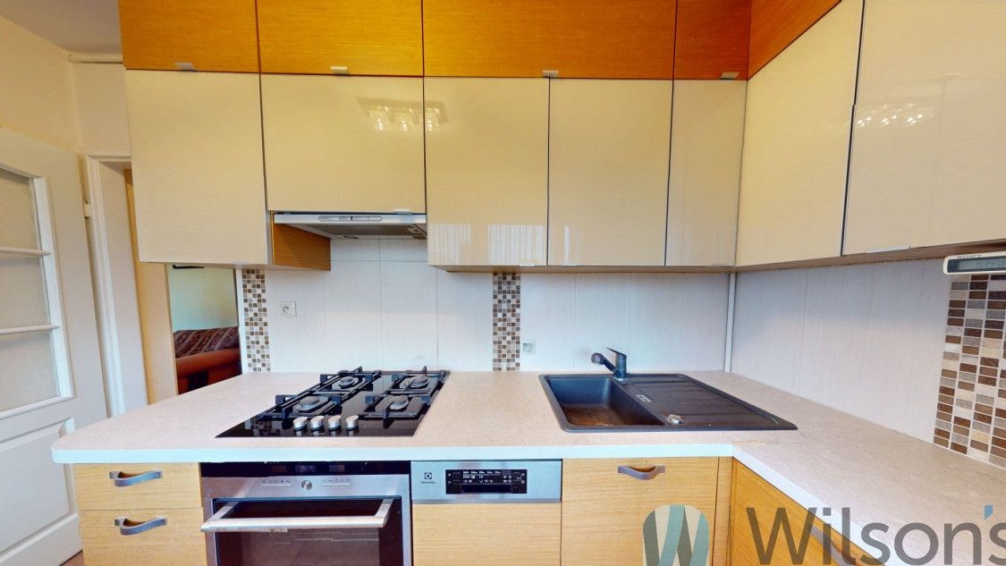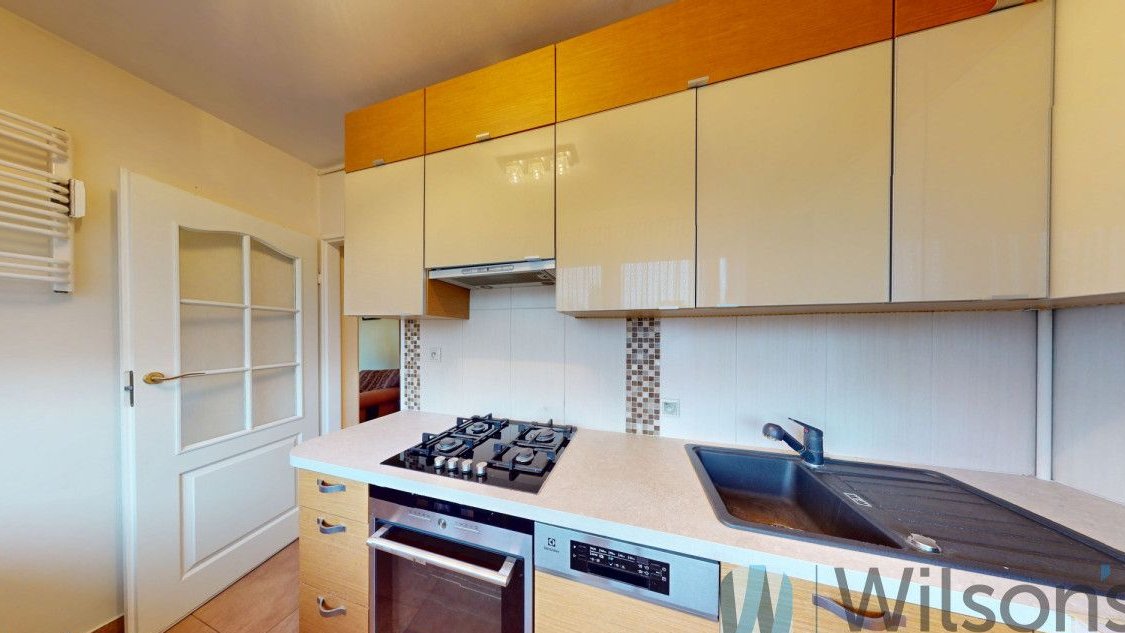 - Kuchnia (ok. 7 m²): oddzielna, widna dzięki dużemu oknu, z fornirowanymi frontami zabudowy meblowej, w pełni wyposażona w sprzęty AGD: kuchenkę gazową z piekarnikiem, okap Siemens, zmywarkę Electrolux, lodówkę Electrolux