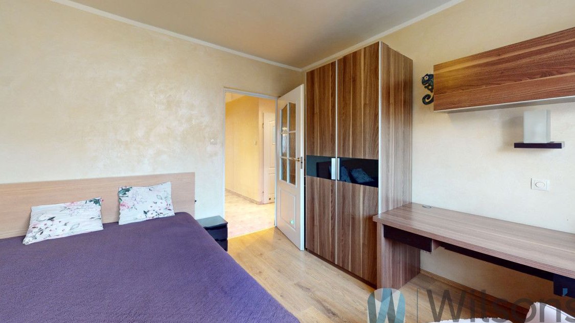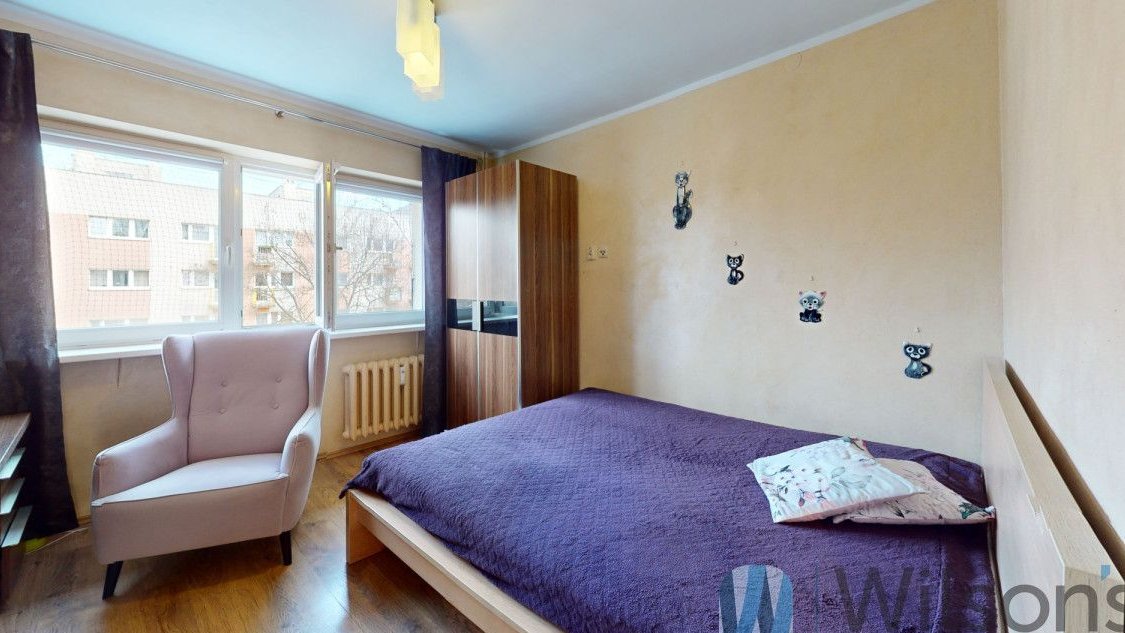 - Sypialnia nr 1 (ok. 12 m²): przytulna, z widokiem na zieleń podwórka, z dwiema szafami, biurkiem i wielkim łożem