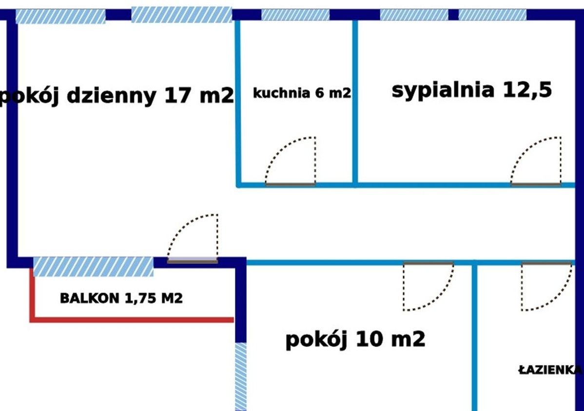 Lokal o pow. 56,6 m2 składa się z pokoju dziennego (17 m2), dwóch sypialni ( 12,5 i 10 m2), 6-metrowej zamykanej kuchni z oknem i łazienki.