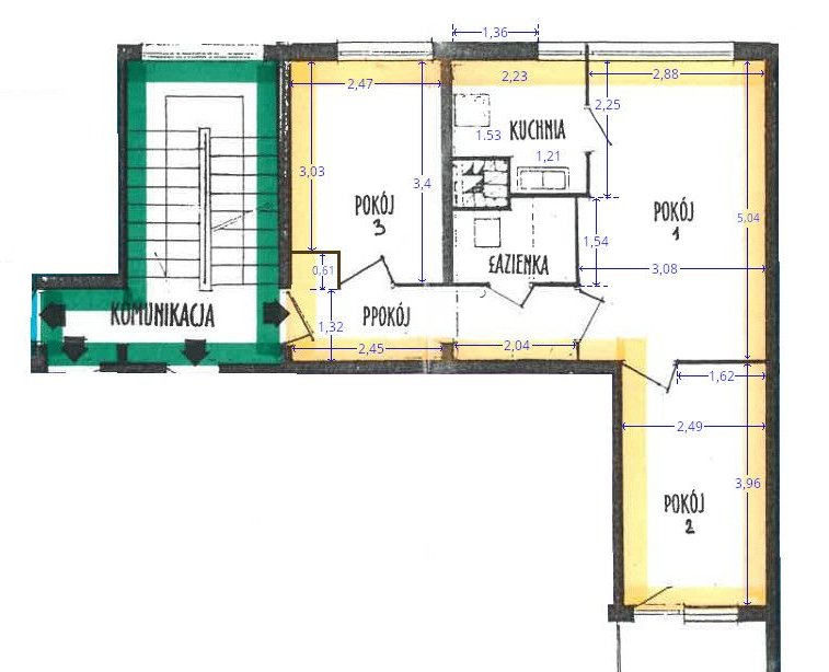 Korzystny układ mieszkania z długim przedpokojem (widoczny na załączonym zdjęciu wraz z przybliżonymi wymiarami)