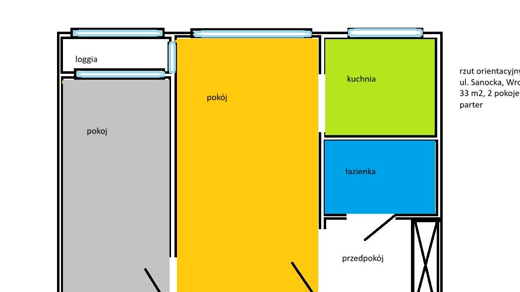 2 pokoje, 33m2, wysoki parter w X piętrowym budynku, z balkonem / loggią zabudowaną oknem, w cenie wyposażenie kuchni, łazienki, przedpokoju, inne meble do uzgodnienia;