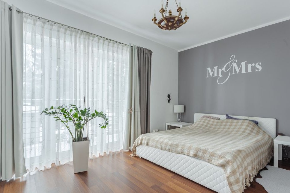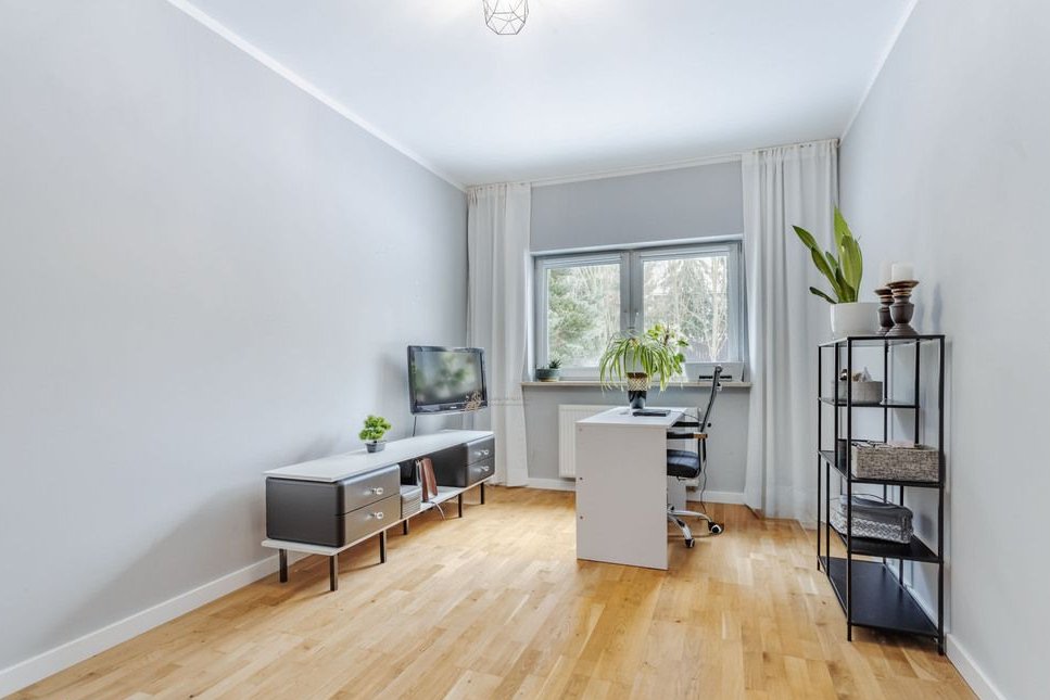 Dodatkowy pokój na tym poziomie powstał z przestrzeni pierwotnie przewidzianej jako garaż i podobnie jak w wielu domach na tym osiedlu został zaadaptowany już na etapie wykańczania na pełnowymiarowe pomieszczenie mieszkalne. Dzięki temu świetnie sprawdzi się jako gabinet, pokój gościnny lub przestrzeń do pracy.