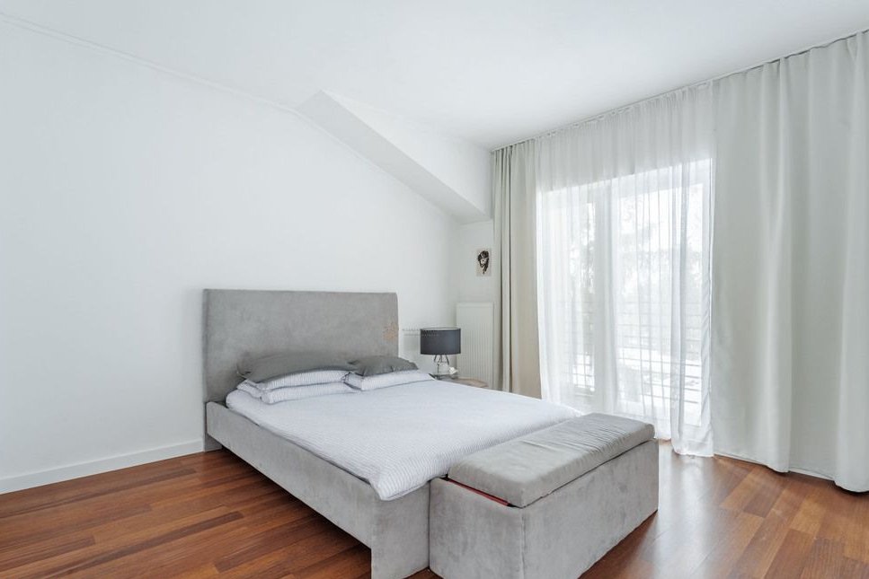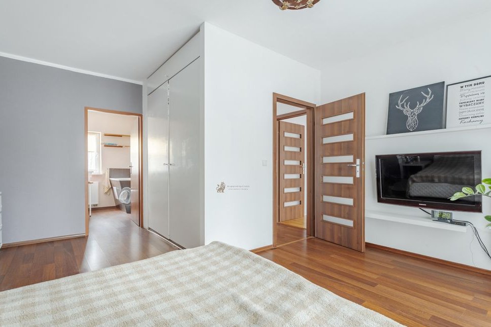 Pierwsze piętro obejmuje dwie sypialnie oraz dużą łazienkę z prysznicem. W większej sypialni znajduje się pojemna szafa wnękowa. Do tej sypialni przylega osobne pomieszczenie zaplanowane pierwotnie jako dodatkowa łazienka. Obecnie nie jest używane, więc można je zaaranżować jako garderobę, prywatne biuro, toaletę lub praktyczne zaplecze. Druga sypialnia jest ustawna i daje dużą swobodę aranżacji.