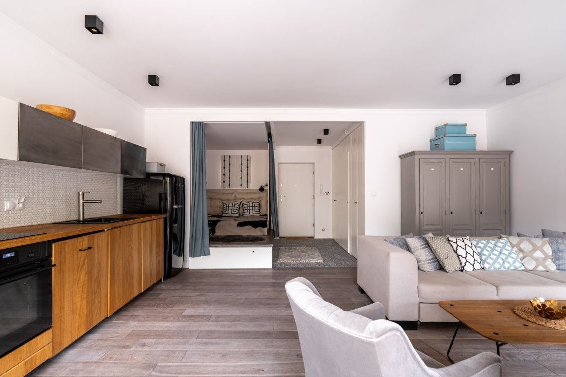 * Salonu z aneksem kuchennym z wydzieloną strefą sypialni,