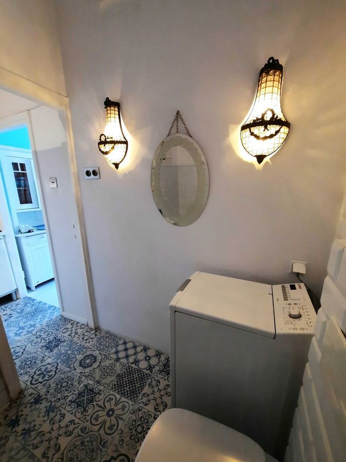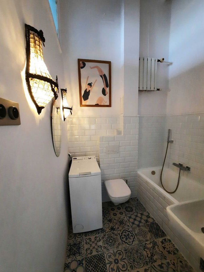 Łazienka z wanną, umywalką, wc i pralką.