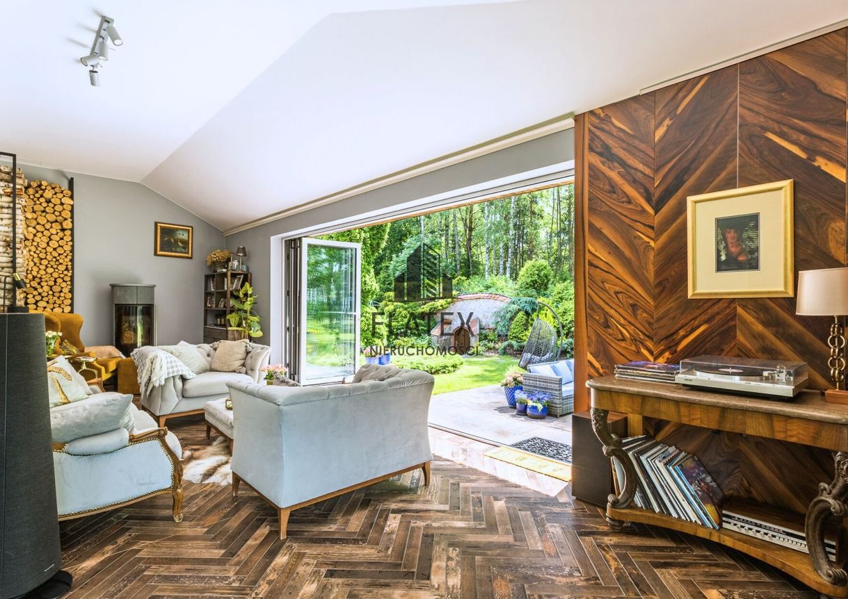 Wnętrza wykończone zostały w wysokim standardzie, z dbałością o detale i ponadczasową estetykę. Duże przeszklenia w salonie otwierają dom na ogród, zapewniając naturalne doświetlenie oraz widok na zieleń o każdej porze roku.