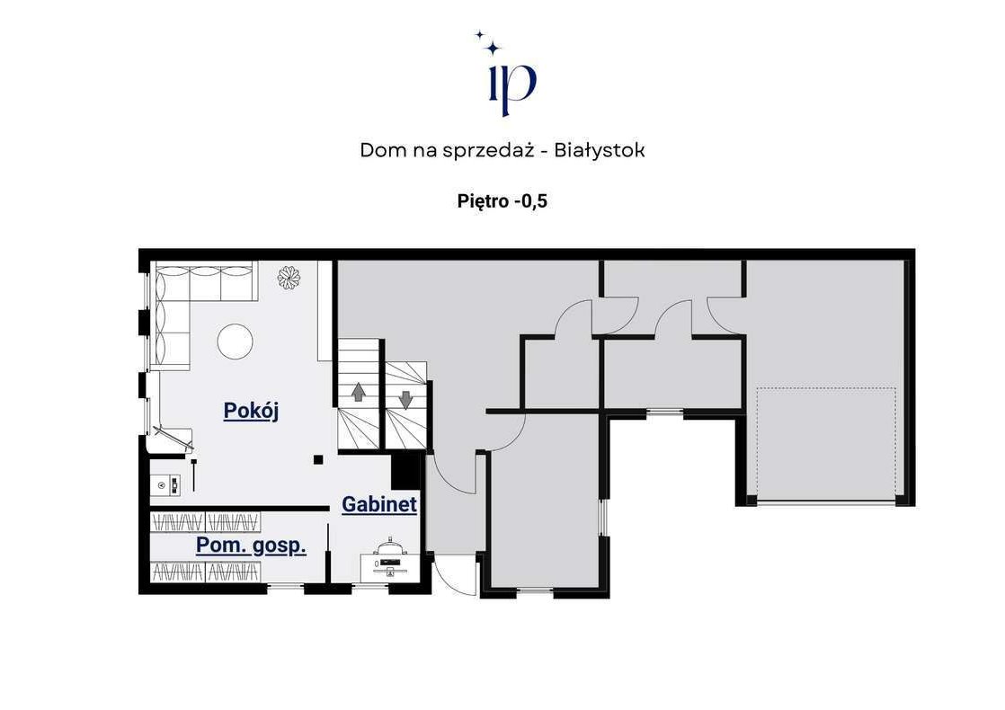 Piętro -0,5: pokój, kotłownia, gabinet, pomieszczenie gospodarcze;