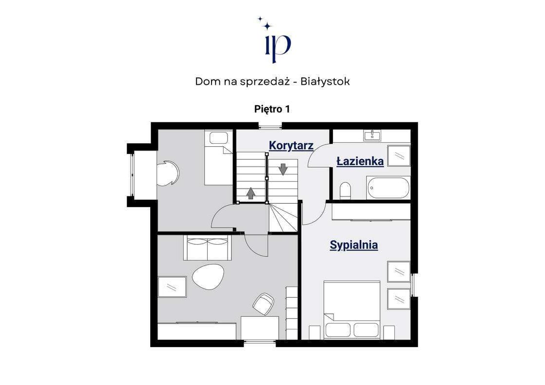 Piętro 1: łazienka z wanną, korytarz, sypialnia główna;