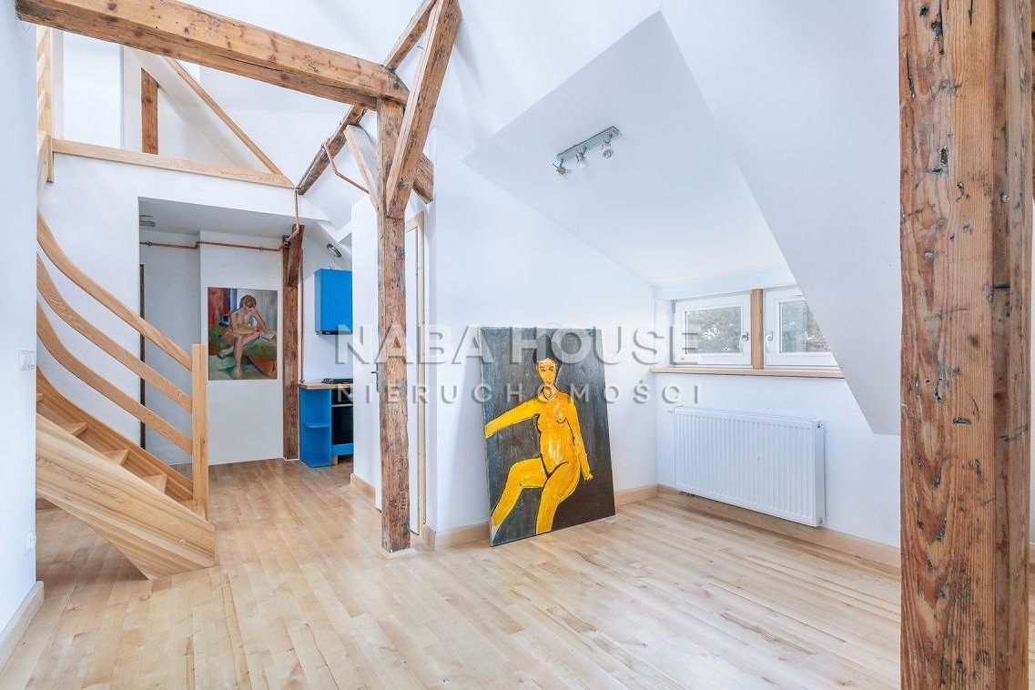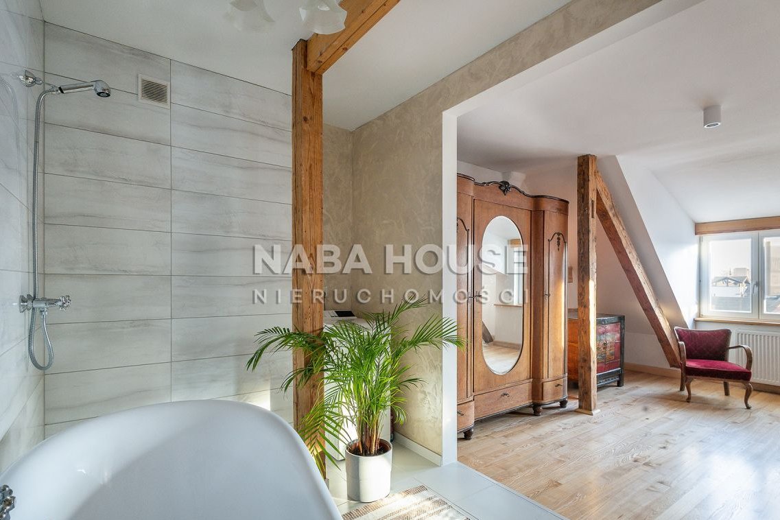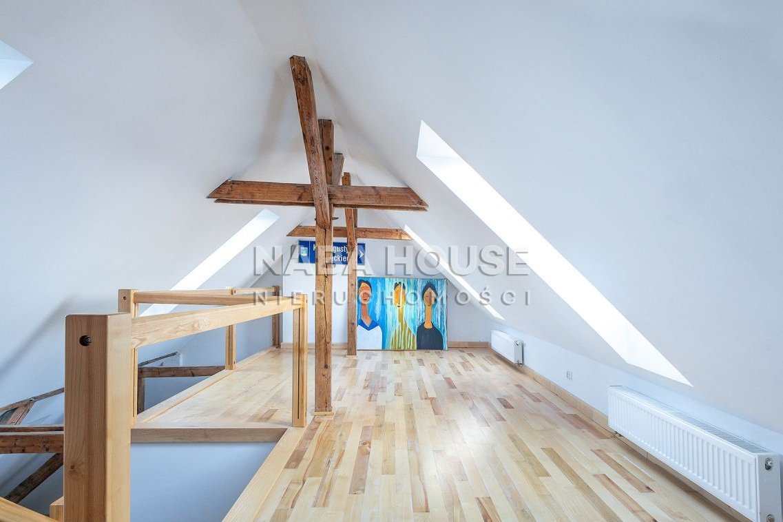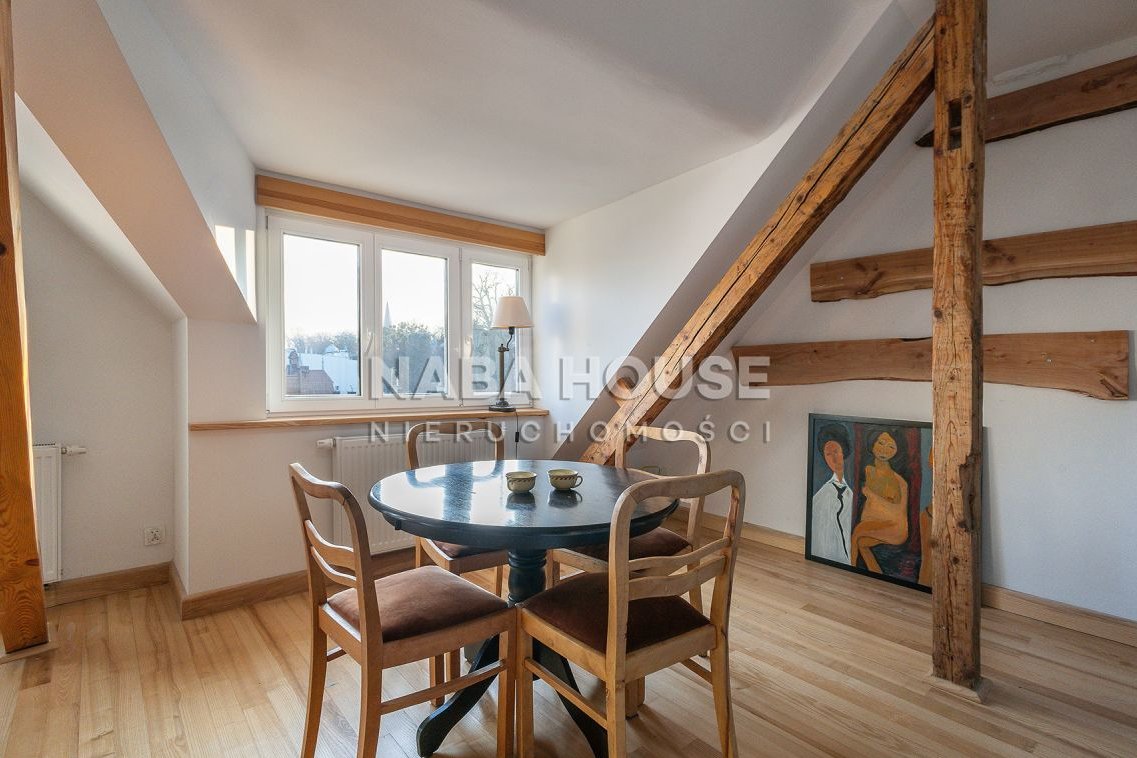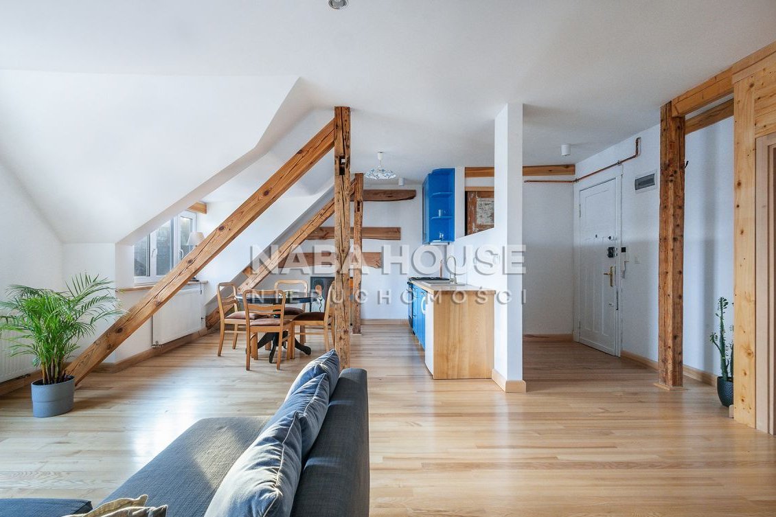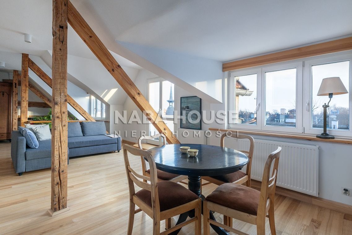 Mieszkanie bardzo ciekawe, jasne, słoneczne, z białymi ścianami, i kuchnią w kolorze morza, odsłania urokliwe belki stropowe, imponuje dużymi, słonecznymi oknami (zarówno w wykuszach jak i w dachu), które wpuszczają dużą ilość naturalnego światła, tworząc wakacyjną, przyjazną atmosferę.