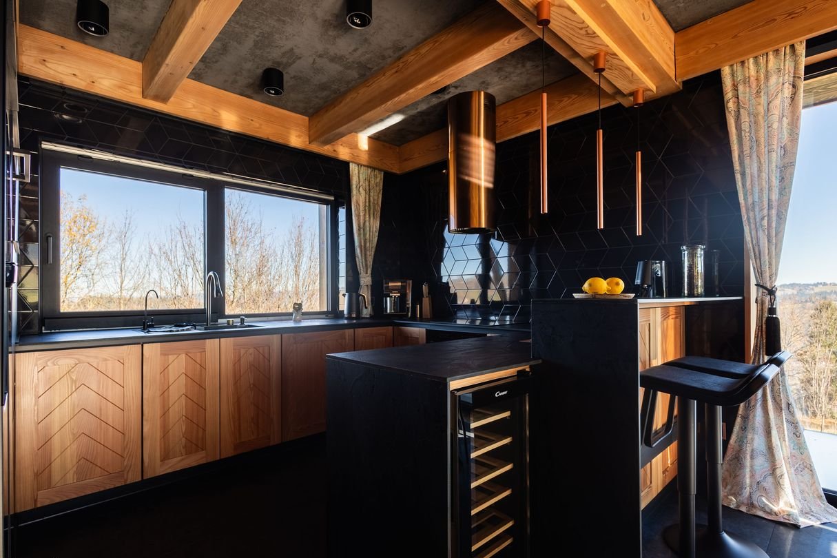 Kuchnia na zamówienie: w pełni wyposażona w sprzęt klasy premium (m.in. ekspres do kawy, lodówka na wino).