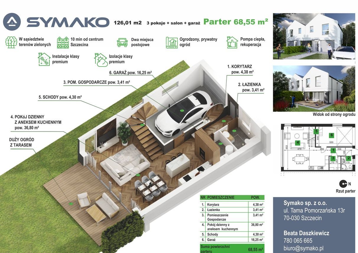1 i 2: o powierzchni 126,07 m² (120,75 m² powierzchni użytkowej + przestrzeń poniżej 220 cm wysokości), z terenem 320/283 m2 wraz z 2 miejscami postojowymi i GARAŻEM w cenie 1 299 000 zł