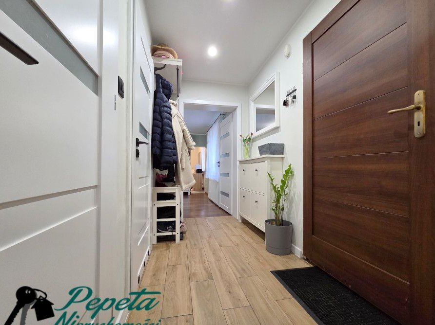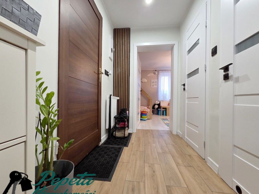 - w korytarzu na podłodze płytki, ściany gładzone/malowane z elementami lameli dekoracyjnych.
