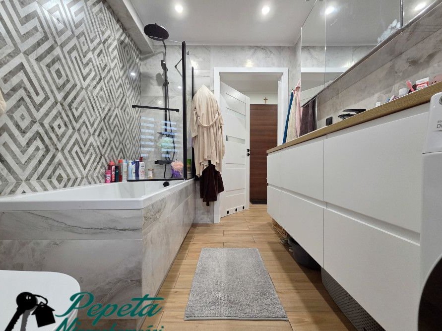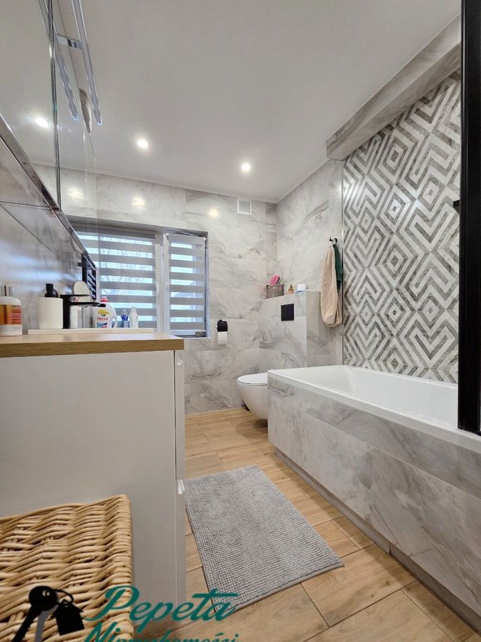- łazienka w nowoczesnych płytkach, wanna z funkcją prysznica, stałe wyposażenie w cenie,