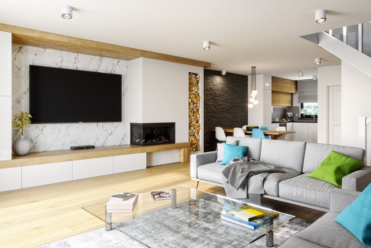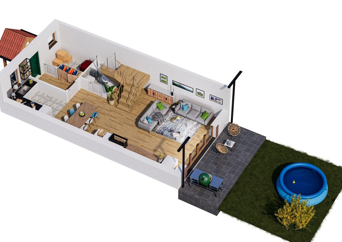 Twój nowy dom ma 110 mkw. powierzchni użytkowej. Na parterze znajdziesz wiatrołap z miejscem na szafę i kotłownię, która może służyć także jako pomieszczenie gospodarcze. Idąc dalej zobaczysz pokój dzienny z dużymi witrynami wspaniale rozjaśniającymi całe wnętrze, z których możesz wyjść bezpośrednio na swój własny taras i ogród. Po drugiej stronie salonu ujrzysz jadalnię oraz otwartą kuchnię ale jeśli tego chcesz możesz ją odgrodzić ścianką od reszty pomieszczenia. Przy schodach znajdziesz toaletę z miejscem na prysznic. Dodatkowo by przestrzeń była jak najbardziej wykorzystana, pod schodami możesz umiejscowić schowek na etapie wykończenia.