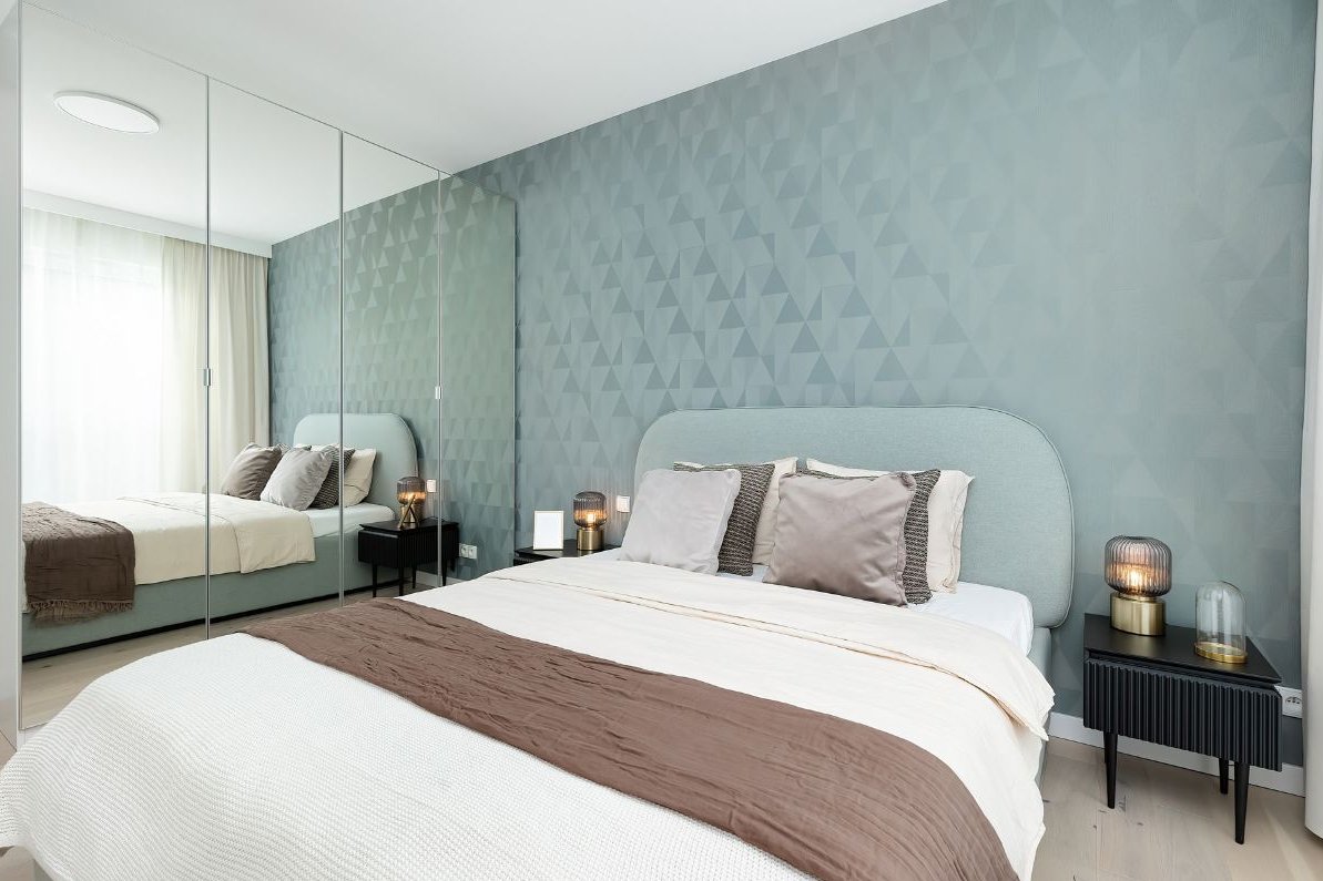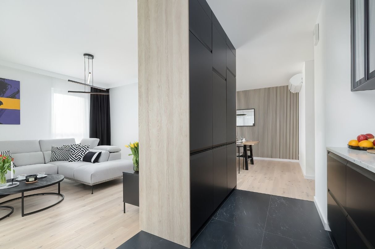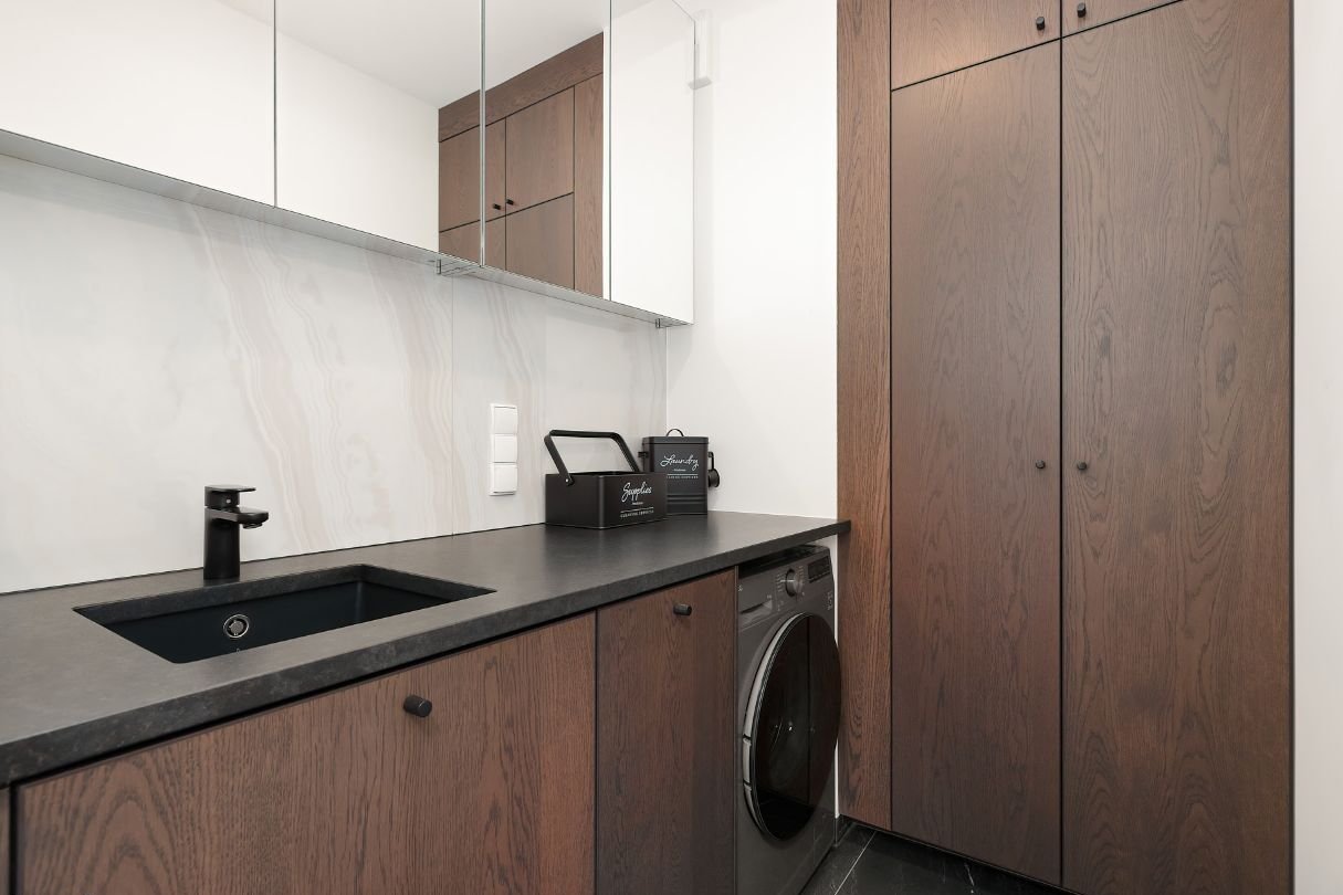Prezentowane mieszkanie 3 pokojowe zostało wykończone pod klucz oraz umeblowane a znajduje się na I piętrze ma pow. 82 m kw. składa się z: pokoju dziennego o pow. 31,02 m kw., aneksu kuchennego o pow. 8,71 m. kw.; drugiego pokoju o pow. 12,43 m. kw., trzeciego pokoju o powierzchni 11,67 m. kw. łazienki 4,57 oraz pralni 2,94 m. kw.. Do mieszkania przynależą 2 balkony: 6,35 m.kw oraz 4,12 m.kw.. W standardzie: klimatyzacja, ogrzewanie podłogowe, rolety zewnętrzne, alarm, system podlewania ogrodu, kosiarka autonomiczna, system inteligentnego sterowania mieszkaniem, pełne wykończenie wraz z umeblowaniem. Koszt miejsca parkingowego w hali garażowej: 95 000 zł brutto. Komórka lokatorska GRATIS!