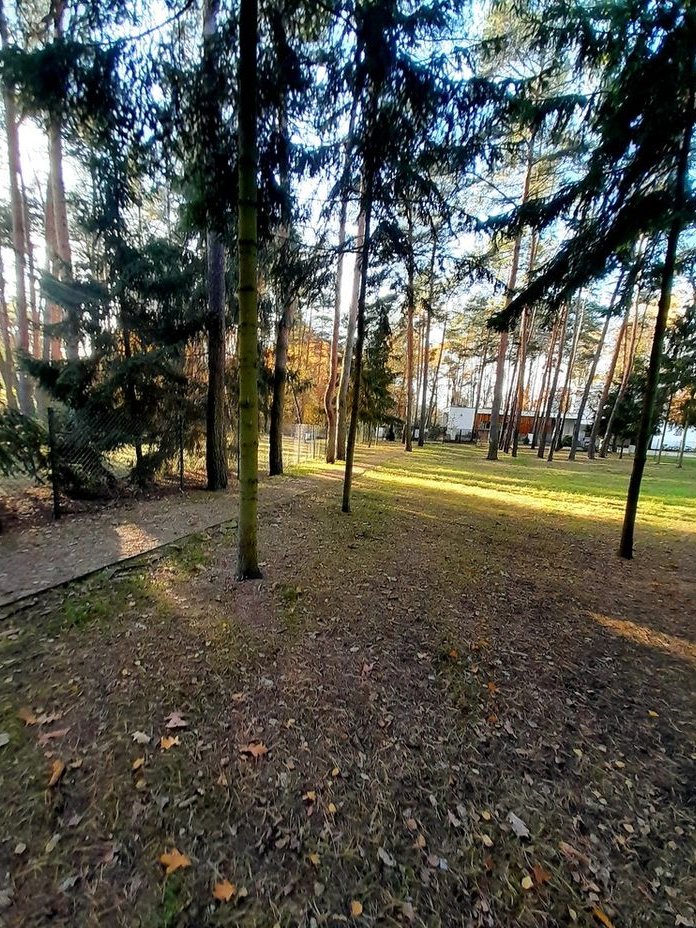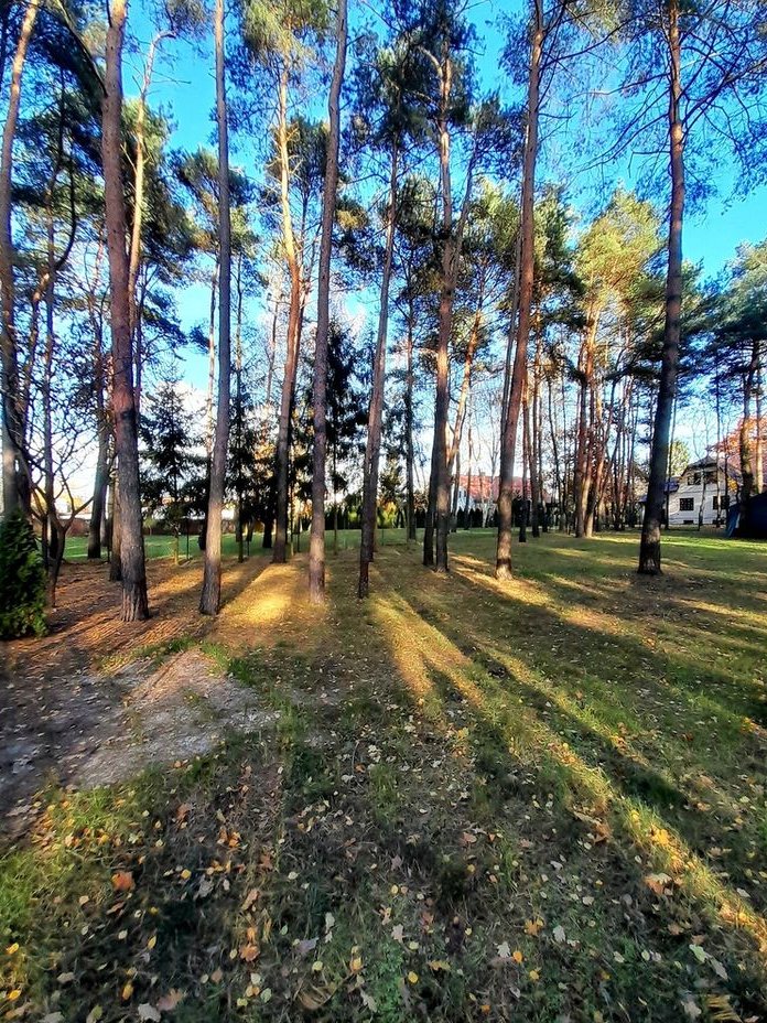 Wzdłuż granicy działki rosną wysokie tuje, sosny i świerki.