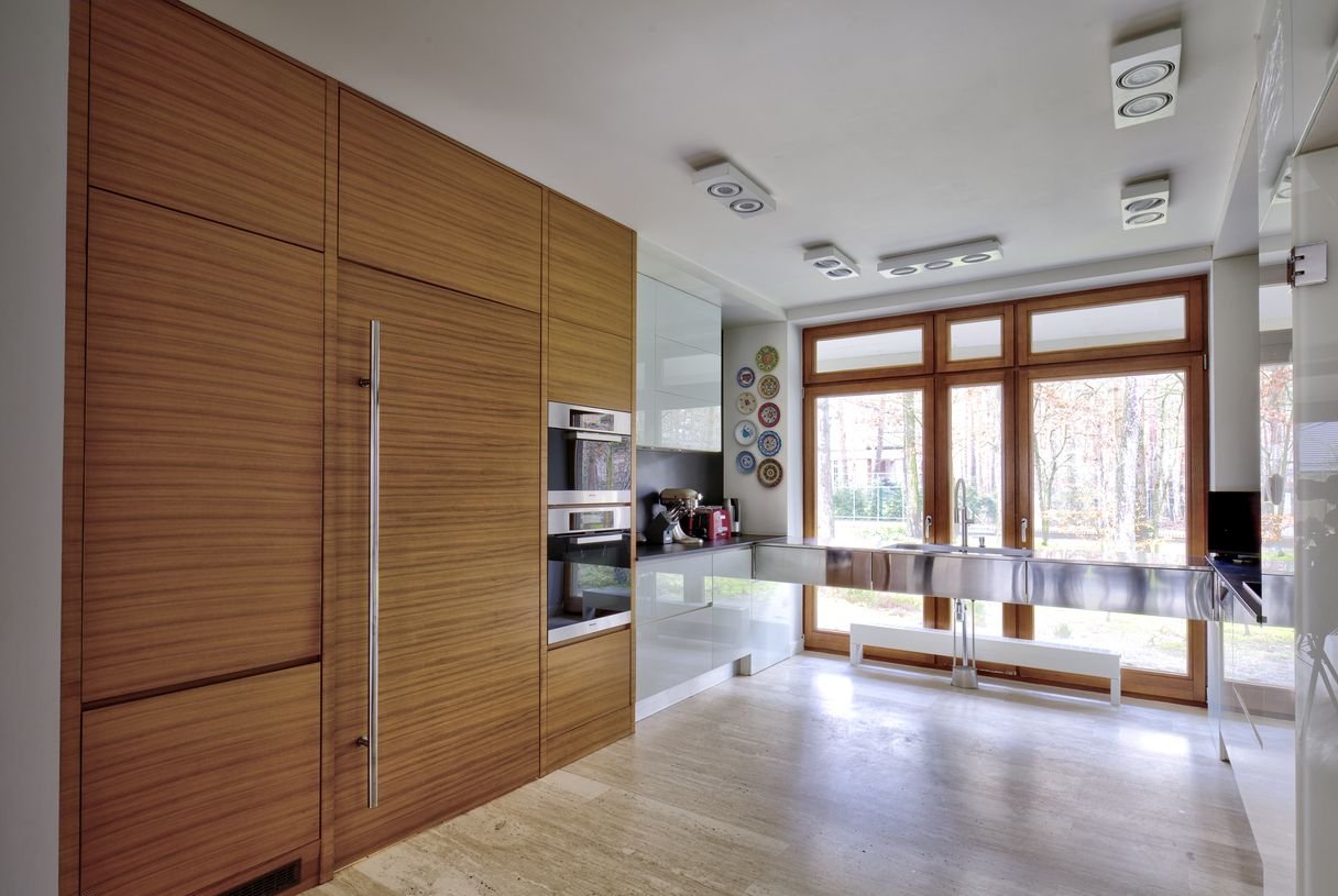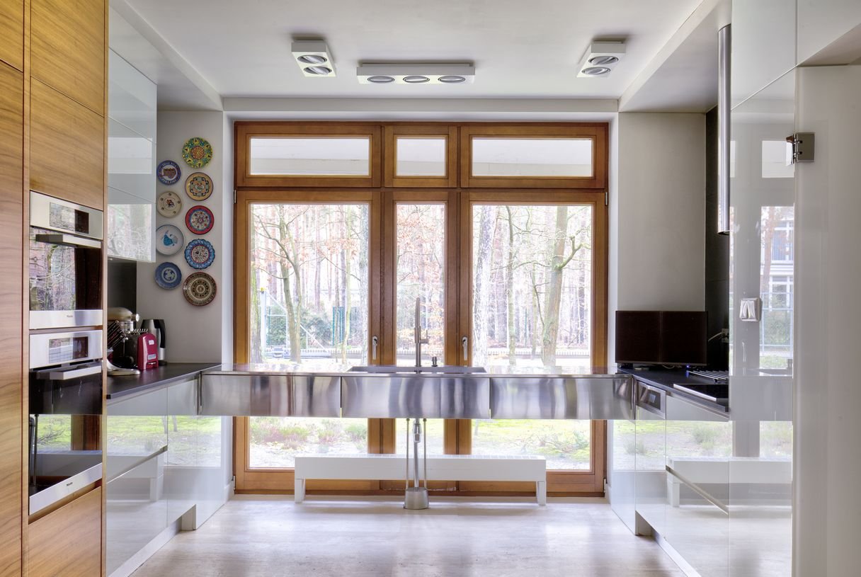 - kuchnia w zabudowie, sprzęt AGD marki Miele, stalowy zlew wiszący na tle okna