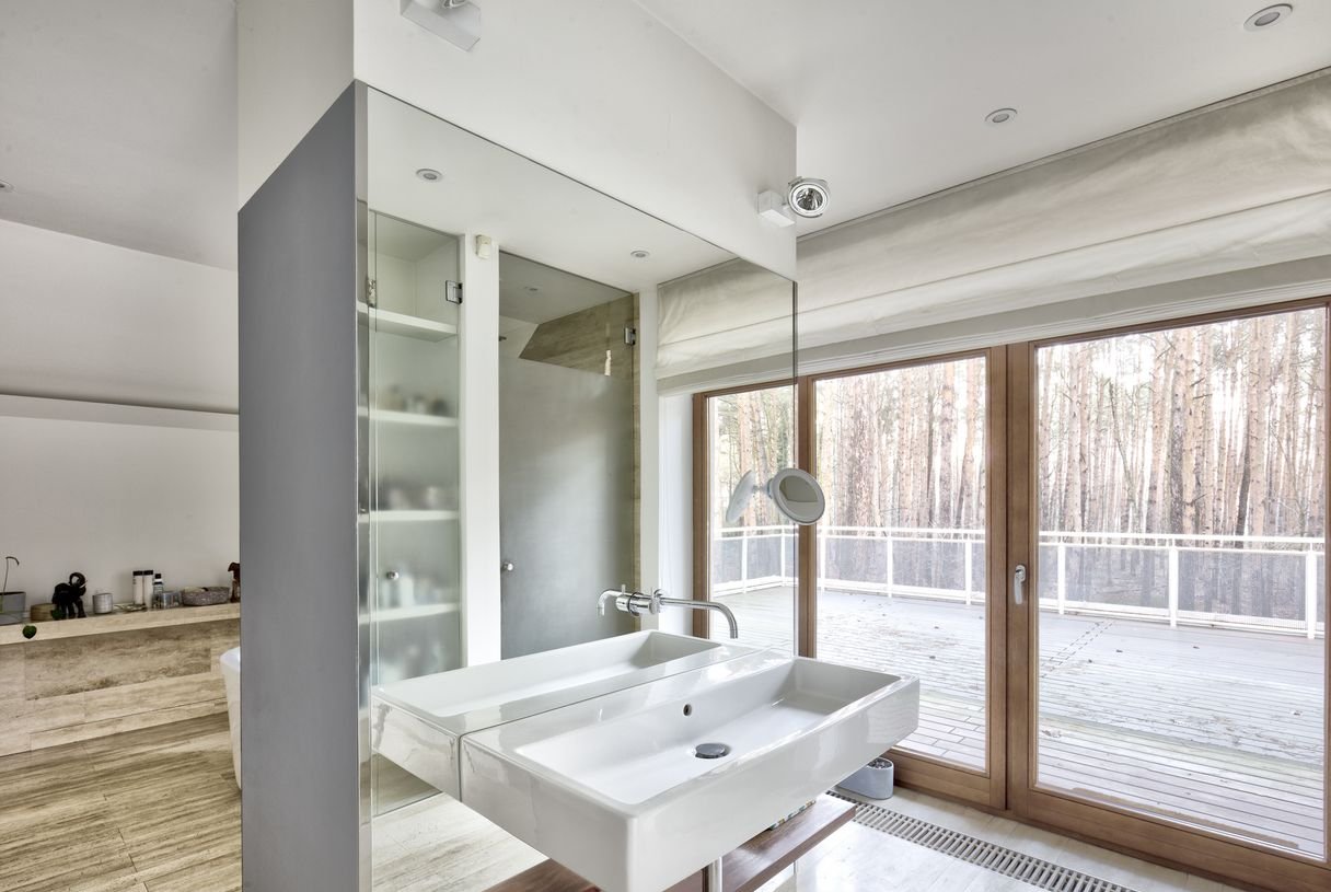 - w łazienkach również trawertyn, armatury i ceramika marki Vola i Duravit