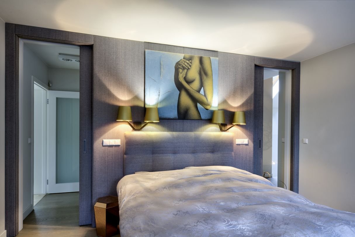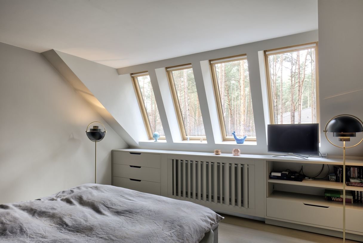 Obszerna sypialnia z własną łazienką (36m kw), druga sypialnia 25m kw z szerokim oknem na ogród, pokój kąpielowy 18,4m kw z wielkim oknem na las i wyjściem na taras, na antresoli dwie głębokie zabudowane garderoby.