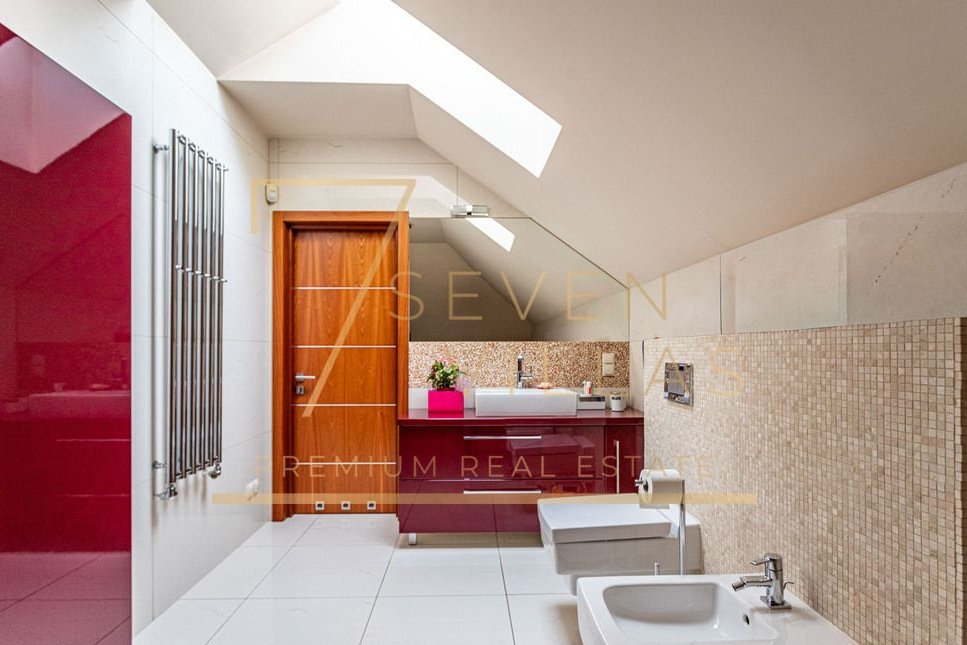 Wnętrza utrzymane są w klasycznym, eleganckim stylu, który podkreśla reprezentacyjny charakter nieruchomości. Duże przeszklenia otwierają dom na piękny widok na dojrzały drzewostan, tworząc atmosferę spokoju i bliskości natury. Starannie zaprojektowany układ pomieszczeń zapewnia doskonałe doświetlenie oraz poczucie przestrzeni.
