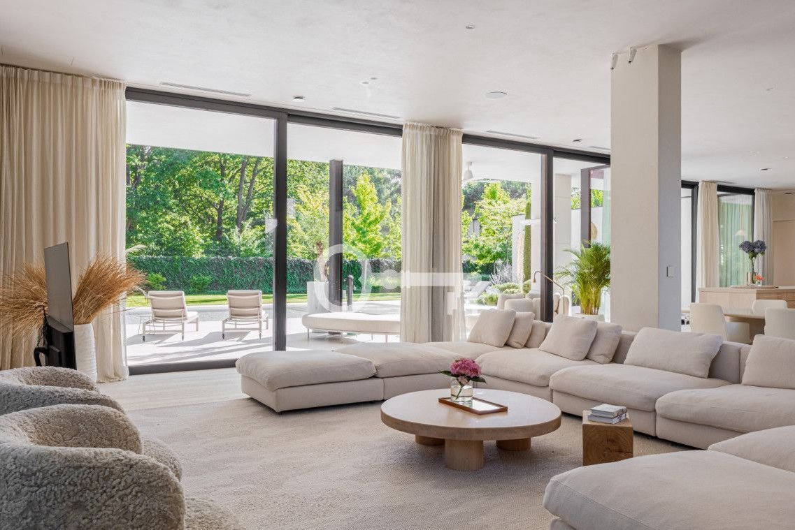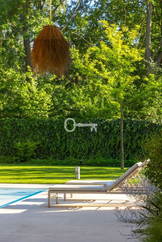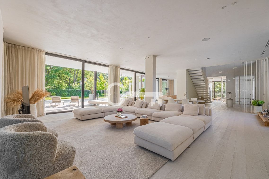 The living area of the house is a spacious, high-ceilinged living room connected to the dining room and kitchen, with an impressive glass wall of windows overlooking the garden. The living room extends onto a sunny wooden terrace with a beautiful view of the pool and trees.