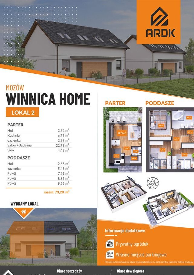 Oferowany lokal dysponuje prywatnym ogrodem oraz dedykowanym miejscem parkingowym wyłożonym kostką brukową. Teren wokół budynku zostanie starannie i estetycznie zagospodarowany – przewidziano utwardzone tarasy z kostki brukowej oraz wydzieloną, uporządkowaną przestrzeń na zasiek śmietnikowy.